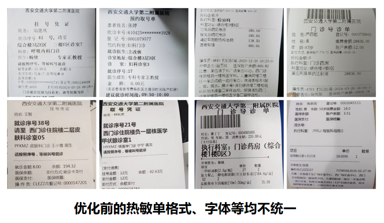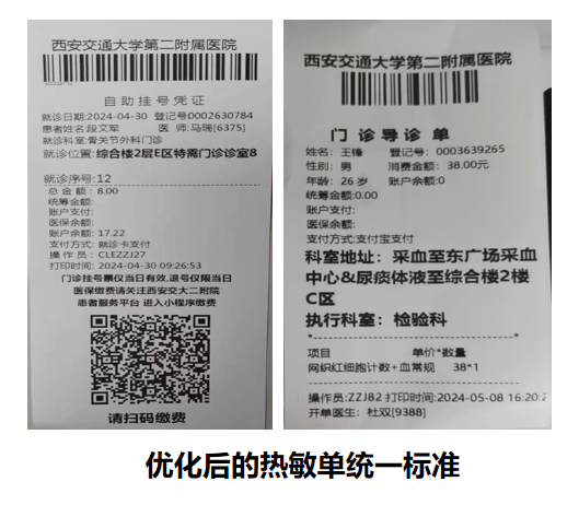 热敏单是门诊患者获取就诊、缴费等相关信息的直接凭证,显示清晰、排版明确的热敏单可以起到很好的就诊环节引导作用。为此,门诊部联合财务部收费挂号处、信息网络部,自4月初启动了门诊热敏单版面优化工作。同时,调研了重庆新桥、交大口腔、西北妇幼等医院的热敏单模板,汲取各医院版面布局优点,并与HIS系统、自助机工程师召开专题会议,逐字逐点的确定我院优化模板进行优化。
