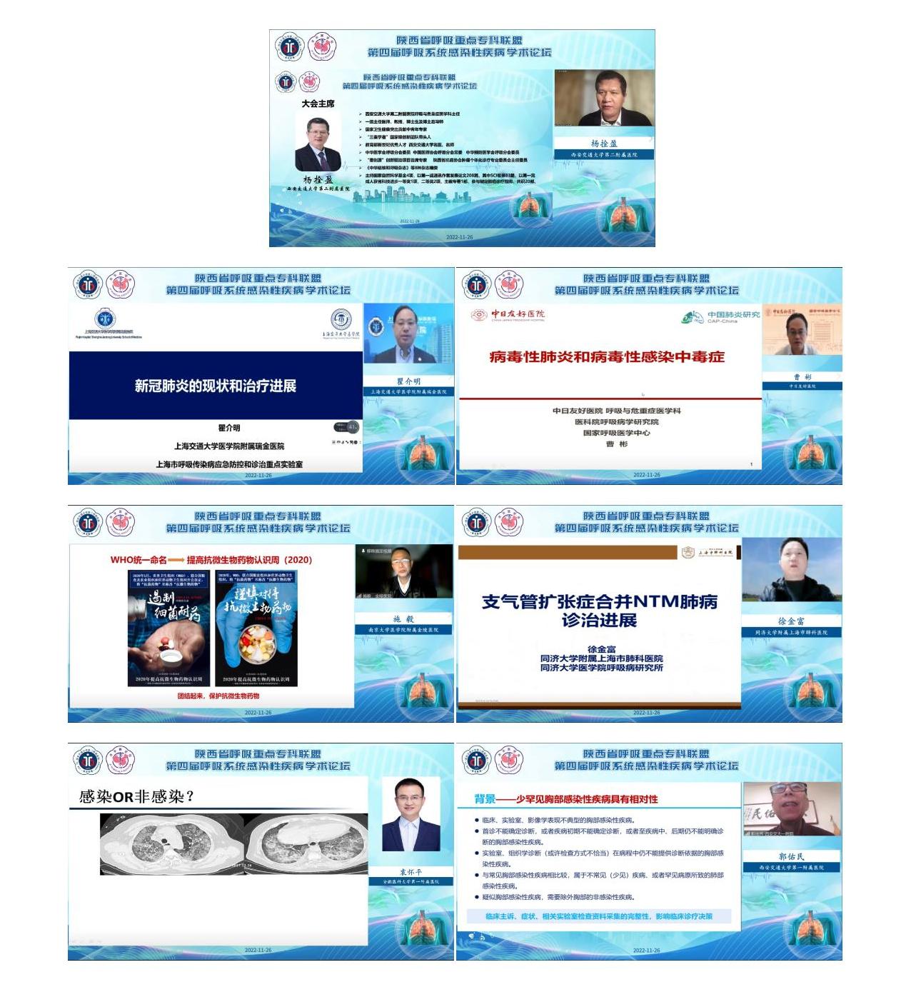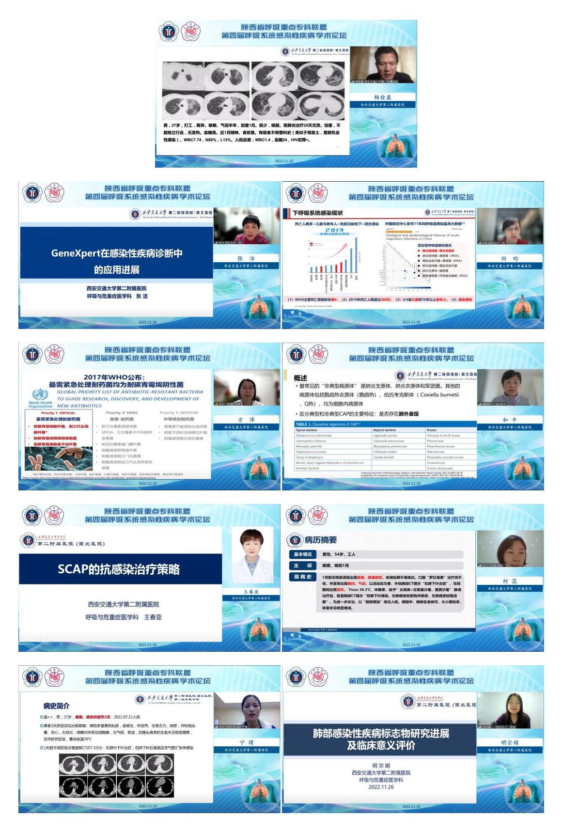 西安交通大学第二附属医院杨拴盈教授、张洁教授、刘昀教授、方萍教授、和平副教授、王春亚副教授、明宗娟副教授及柯蕊及宁璞医生分别围绕耶氏肺孢子菌肺炎、GeneXpert在感染性疾病诊断中的应用、mNGS在下呼吸道感染的应用、碳青霉烯耐药革兰氏阴性菌诊疗、非典型病原体诊治、重症肺炎抗感染治疗策略、肺放线菌诊治、肺诺卡菌诊治及肺部感染性疾病标志物的研究进展展开了精彩讲授。会议内容丰富实用,上线人数逾万,参会人员纷纷线上留言,表示讲座内容实用性强,临床指导价值大,获益颇丰。