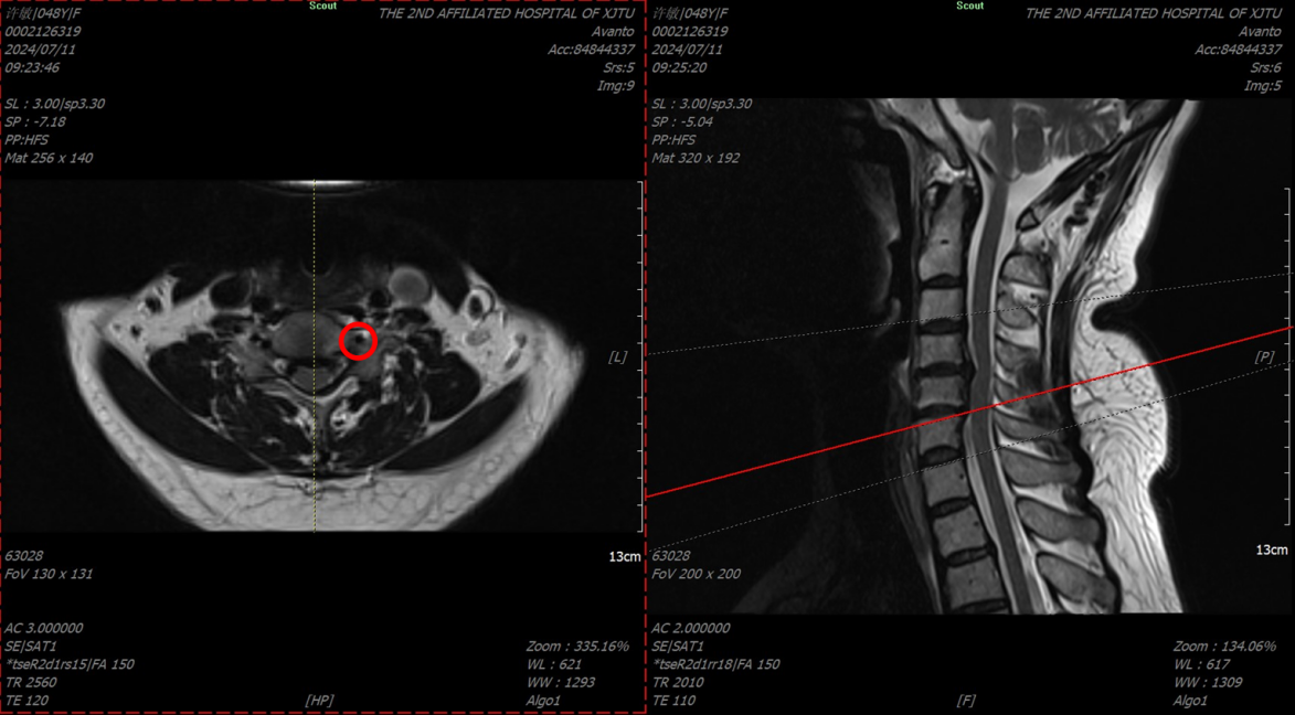 图3颈椎MRI(椎动脉在颈5/6层面存在受压)