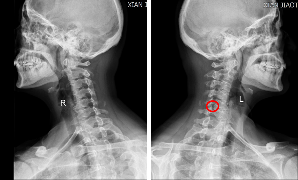 图2颈椎双斜位片(左侧颈5/6钩椎关节增生明显)