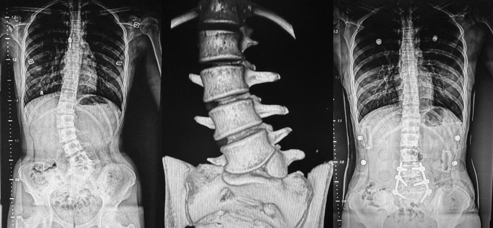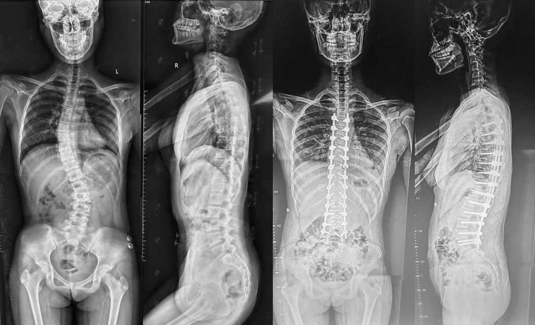 病例3是一名15岁的青少年特发性脊柱侧弯患者,由于保守治疗无效,侧弯度数逐渐增大,严重影响日常生活。经专家团队仔细阅片和详细测量后确定为临床上较为少见的LENKE6型脊柱侧弯,同时制定了详细的手术方案,由李浩鹏主任、蔡璇副主任及王瑞主治医师成功为患者实施了脊柱畸形矫正术,获得了教科书般的矫正效果,畸形矫正率近100%。术后患者家属激动表示感谢治疗团队让其孩子重获挺拔人生(图3)。