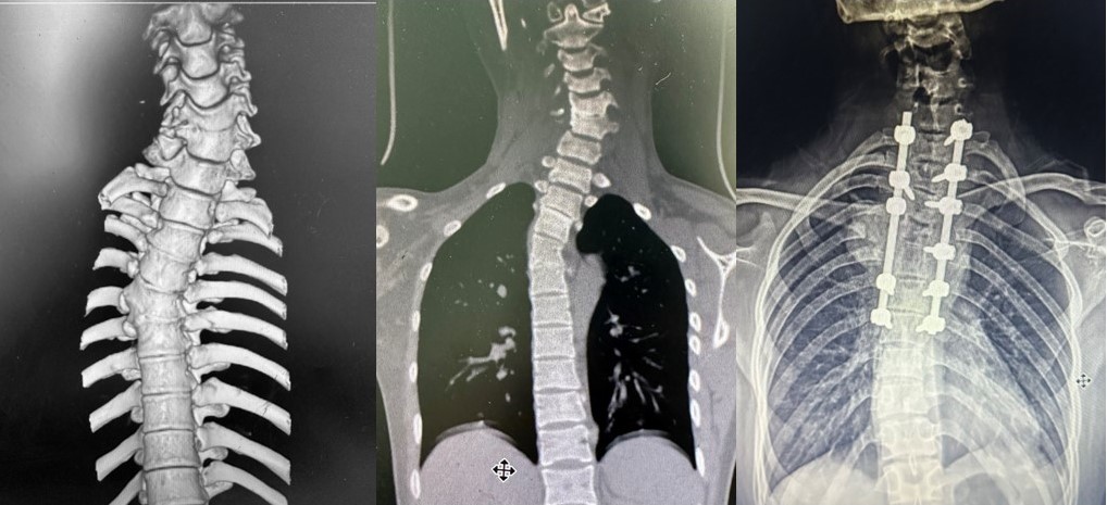 近日,我院骨科中心-脊柱与骨肿瘤病区脊柱畸形治疗组连续完成多台复杂脊柱畸形的矫正手术,再次展示了其在脊柱外科领域的卓越实力和技术水平。脊柱矫形手术是骨科风险最高、难度最大、水平最高的手术操作之一。而我院本次开展的手术为颈胸段和腰骶部半椎体畸形导致的脊柱侧弯,是侧弯中较为复杂的类型,均需截骨和半椎体切除后再进行畸形矫正,相比其它脊柱侧弯手术而言,更复杂,风险更大,难度系数也更高。手术由我院骨科中心李浩鹏主任、脊柱与骨肿瘤病区王栋主任及畸形治疗组长蔡璇副主任领衔,团队成员凭借丰富的临床经验和精湛的手术技巧,成功完成了这三例高难度的脊柱畸形病例。