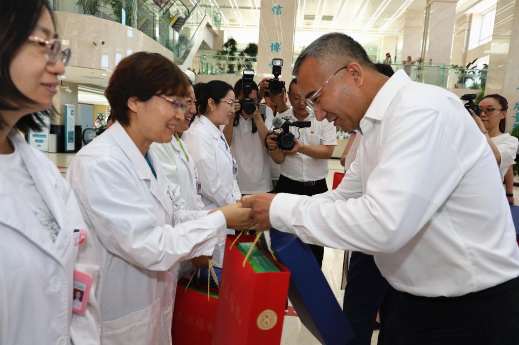 仪式后,凯赛尔·阿不都克热木副主席与张立群校长一行亲切慰问了西安交通大学第二附属医院驻疆医疗队员,并实地参观调研了新疆医院建设进展与开诊情况,走访了咳喘管理中心、检验科、放射影像科、急诊重症医学科、急诊科。