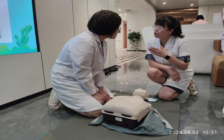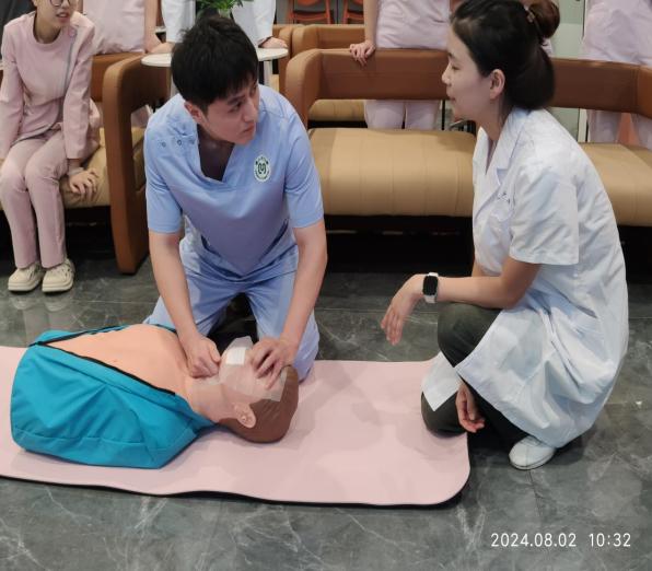 为了让参与者更好地掌握CPR技能,朱丹护师进行了现场示范,并邀请大家亲自上手练习。在朱丹护师及胡菲护师的指导下,大家轮流进行胸外按压和人工呼吸的练习,通过一对一的教学指导,确保每位参与者都能正确掌握CPR技能。