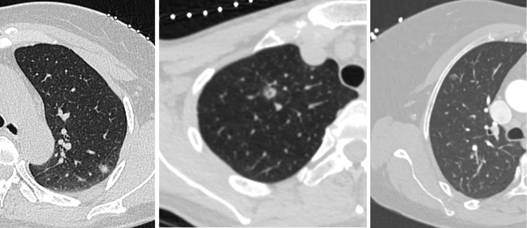 行CT引导下肺结节术前定位的几例患者均为肺内磨玻璃密度结节,且均较小,CT介入团队通过CT扫描的精准测量和定位,成功完成了手术。CT引导下肺结节术前定位技术是指在外科手术前,通过CT引导,在靶结节周围置入定位针,为手术医生在术中寻找并切除靶结节提供了精准指引。这一技术的应用,不仅提高了手术的成功率,还最大限度地减少了对周围组织的损伤。通过术前精确的定位,手术医生能够更加精准地定位到病变位置,确保手术操作的准确性和安全性,为患者带来了更小的手术风险和更短的恢复期,此外,这一技术还可以让病理科医生更准确地对标本组织进行切片,进而定性诊断。