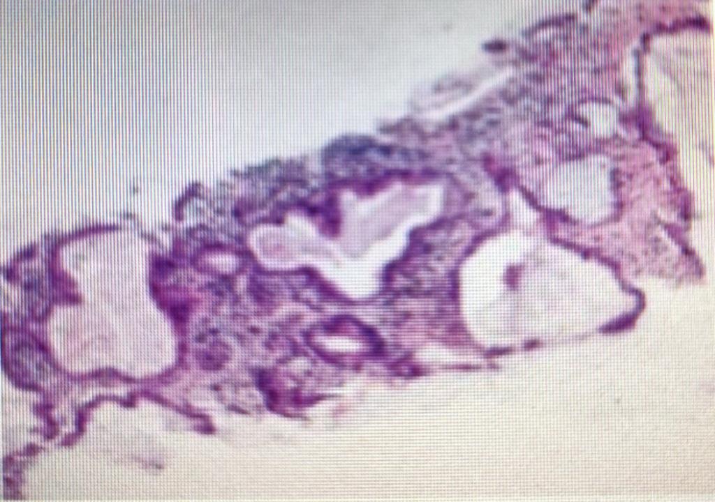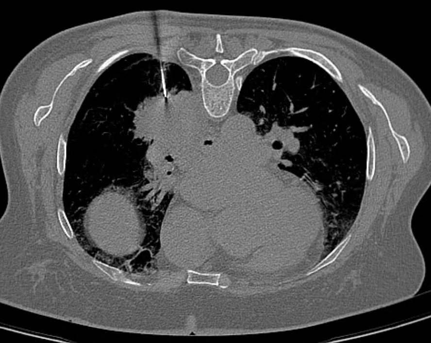 行肺穿刺活检术的是一位64岁的女性患者,两月前于当地医院行结核筛查发现结果异常,进一步行肺CT平扫发现右侧肺门占位性病变,增强扫描提示右侧肺门中央型肺癌,伴肺门淋巴结肿大,随后患者两次行支气管镜检查,结果均未见恶性细胞,仅见炎性细胞浸润,当地按结核治疗一段时间。2024年7月16日入我院行PET-CT检查提示右肺下叶背段软组织肿块,考虑恶性病变,结核不除外。肿瘤科专家团队邀请医学影像科CT介入团队进行深入讨论和综合评估后,决定行CT引导下的经皮肺穿刺活检术以明确诊断。征得患者及家属的知情同意并签字后,医学影像科CT介入团队仅使用10分钟即完成手术,术中取得3条组织后送病理,术后患者无不适,安全返回病房。几天后病理结果显示浸润性粘液腺癌。