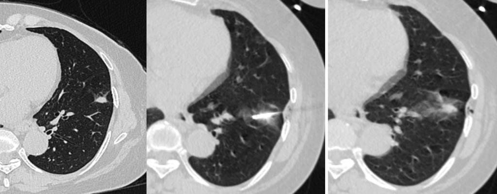 行射频消融术的患者是一名61岁的女性,2年前曾行肝内胆管癌切除术,此次入院肺部CT提示左肺下叶内基底段一大小约12*8mm高密度结节,较前对比明显增大,考虑肺转移瘤。胸外科与医学影像科专家团队进行深入讨论和综合评估,告知患者及家属具体治疗方案及替代方案后,患者及家属拒绝外科手术,决定选择CT引导下肺肿瘤射频消融术。经过周密的术前准备,医学影像科CT介入团队在CT定位引导下精准穿刺病灶位置,成功实施了射频消融治疗。手术持续约1小时,术中患者耐受良好,术中、术后未见明显出血、气胸、胸腔积液等并发症;术后达到肿瘤消融目标,且患者能即刻下床活动,不影响正常生活。