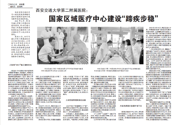 2024年1月2日,西安交通大学第二附属医院洛阳医院小儿外科正式开科,国家重点专科实现平移,将整合型医疗服务新模式落到实处。上述进展,得益于西安交通大学第二附属医院在区域医疗中心建设中探索形成的“3551”模式。