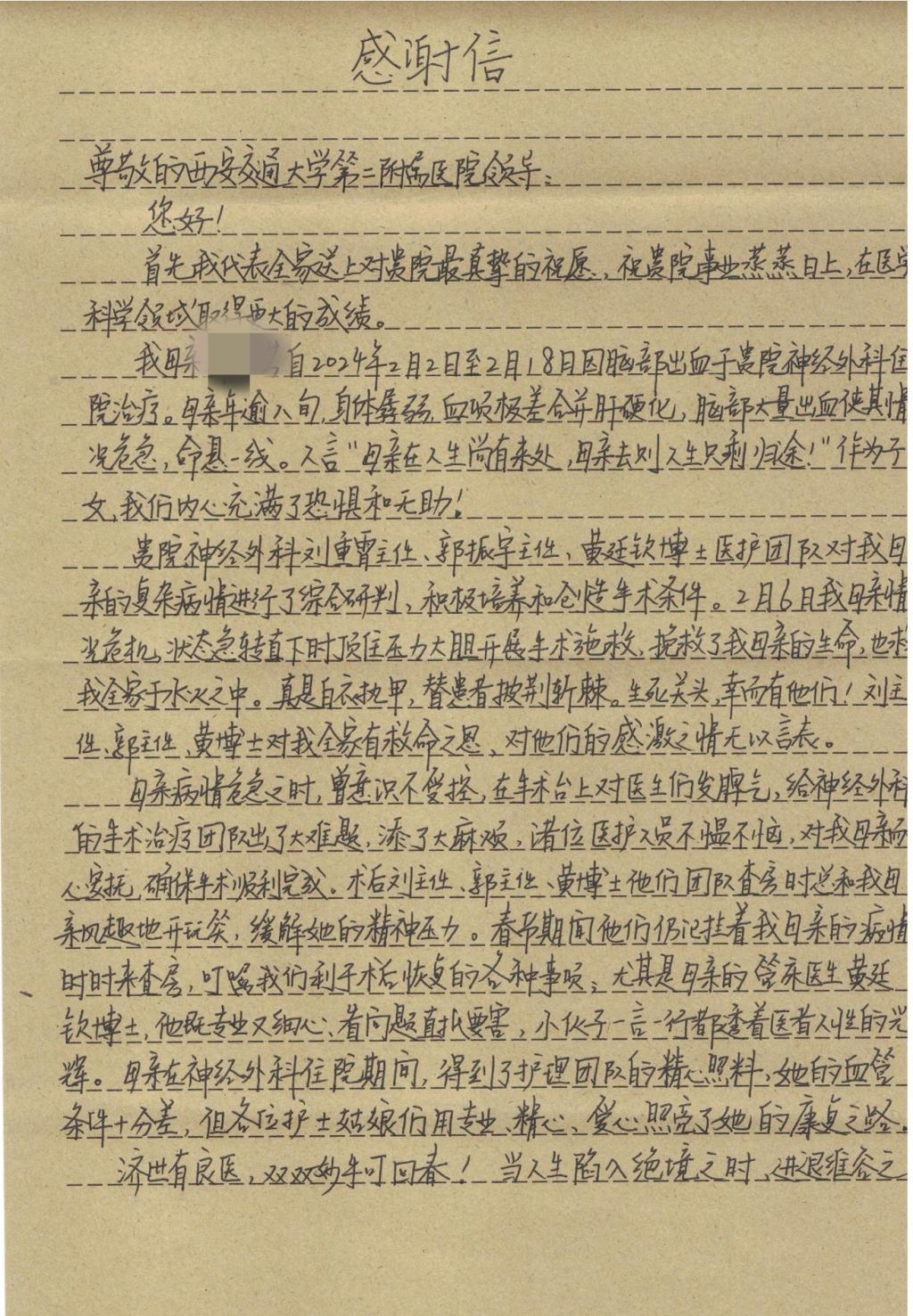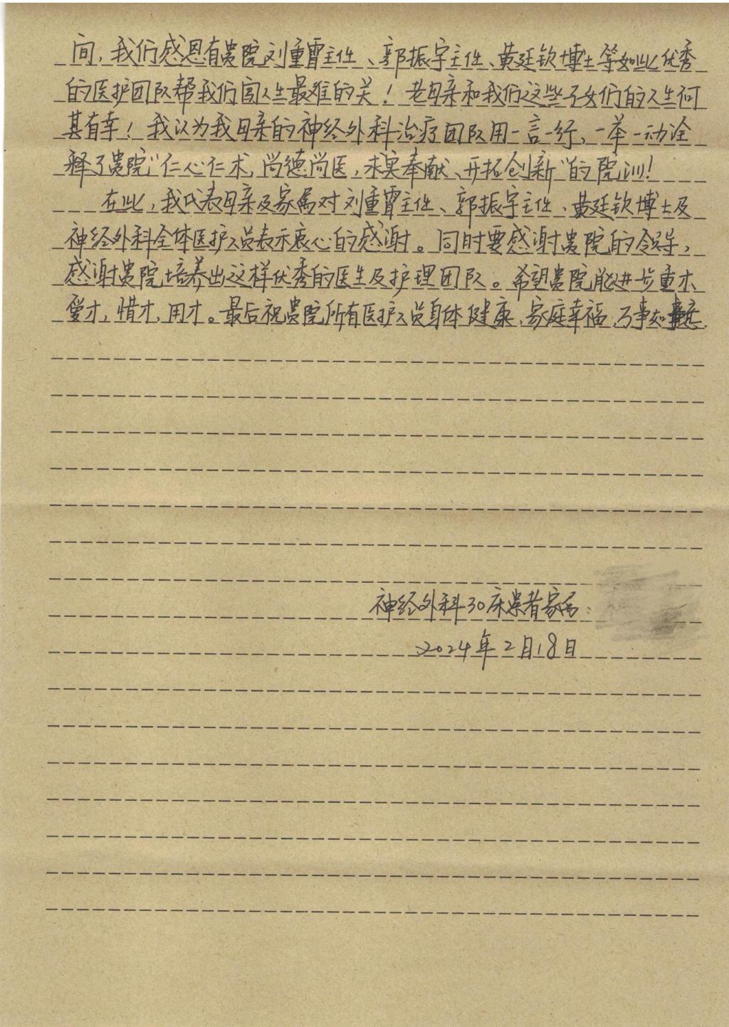 一纸感谢信,笔尖抒真情。2月18日,我院收到一封来自神经外科患者韩××家属的感谢信,信中质朴真诚的情感浓缩笔端,表达了对我院神经外科副主任医师刘重霄、郭振宇,黄延钦医生和护理团队救治其母亲的感激之情。