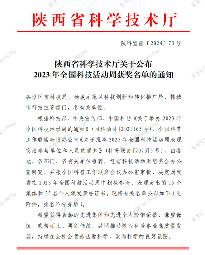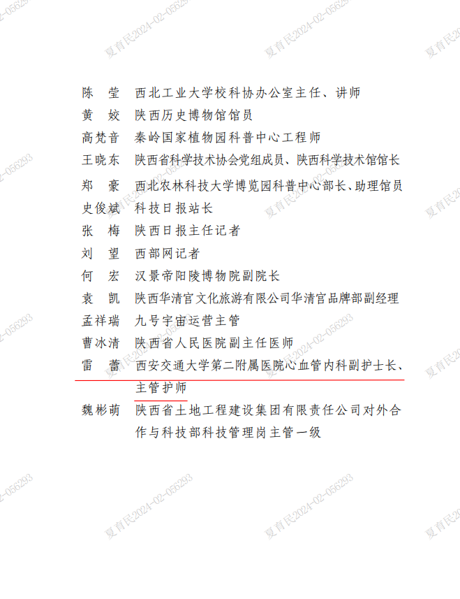 近日,陕西省科学技术厅对我省在“2023年全国科技活动周”中积极参与、表现突出的15个集体和35名个人颁发荣誉证书。卫健系统中只有2人被评为先进个人,其中一人是我院心血管内科副护士长、主管护师雷蕾。