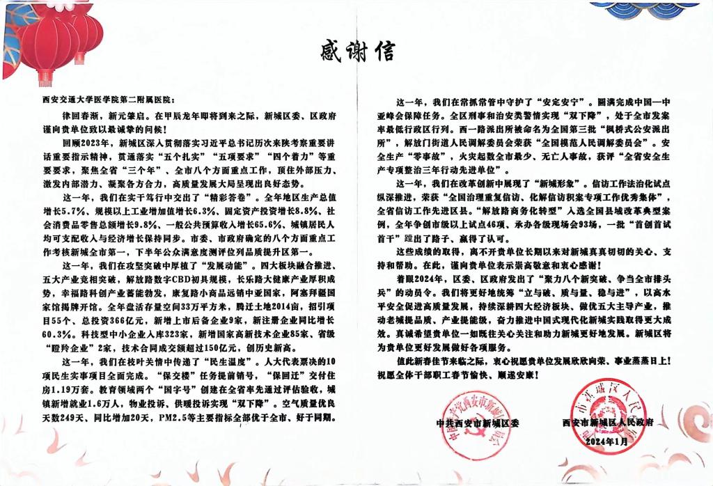 2月2日,我院收到西安市新城区委、区政府送来的感谢信。感谢信字里行间的崇高敬意和感激之情,是对我院在2023年助力新城区经济社会发展、服务百姓健康做出贡献的肯定和支持,是荣誉,更是动力。感谢信全文如下: