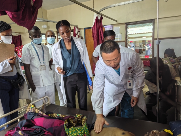 西安交通大学第二附属医院心血管内科胡艳超主治医师在姆祖祖中心医院内科承担诊疗指导工作。初到医院,胡艳超医生就指导当地医生历经两个小时成功救治一例危重症急性冠脉综合征患者。抢救完成后,胡艳超医生组织内科全体团队对抢救用药和措施进行详细总结,并研讨下一步诊疗方案。内科John主任代表患者表示感谢,对胡艳超医生竖起大拇指,惊叹于这样危重的病例在中国医生的救治下竟然能获得如此明显的抢救效果。胡艳超医生在进入姆祖祖中心医院的第一天就遇到了疟疾合并房扑、室性早搏等心律失常、重度围生期心肌病和三度房室传导阻滞等多个重症病例,因此产生了要协助姆祖祖中心医院完善急性心血管疾病诊疗体系的想法,进一步提升当地医院心血管疾病危重症的诊治水平。“授人以鱼,不如授人以渔”,胡艳超医生希望通过自己的努力为姆祖祖中心医院留下一支“带不走的中国医疗队”。