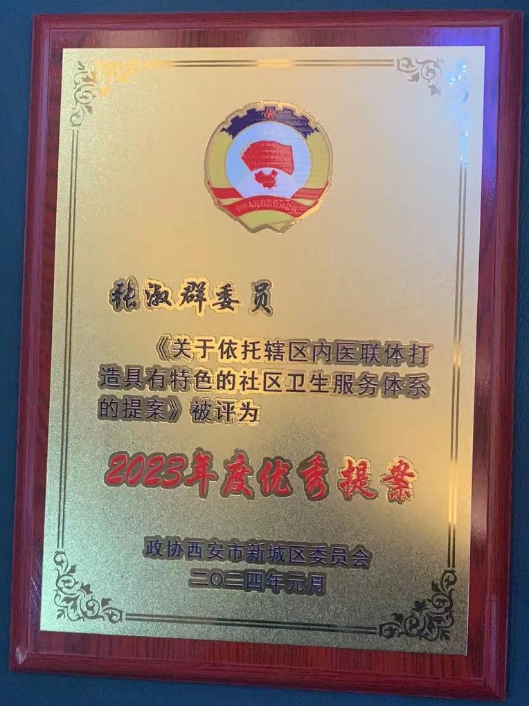 2023年我院各级人大代表、政协委员积极履职建言,为地方经济社会发展做出了积极的贡献,得到了各级人大、政协的肯定,也为我院赢得了荣誉。新城区政协常委张淑群教授被政协西安市新城区委员会评为“2023年度优秀政协委员”,张淑群委员提交的《关于依托辖区内医联体打造具有特色的社区卫生服务体系的提案》被政协西安市新城区委员会评为“2023年度优秀提案”。