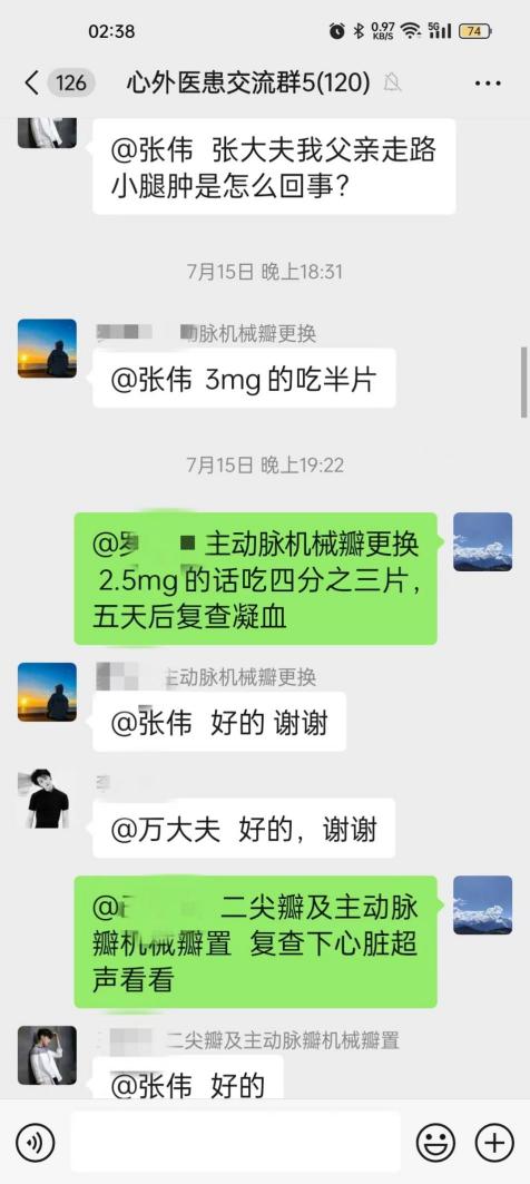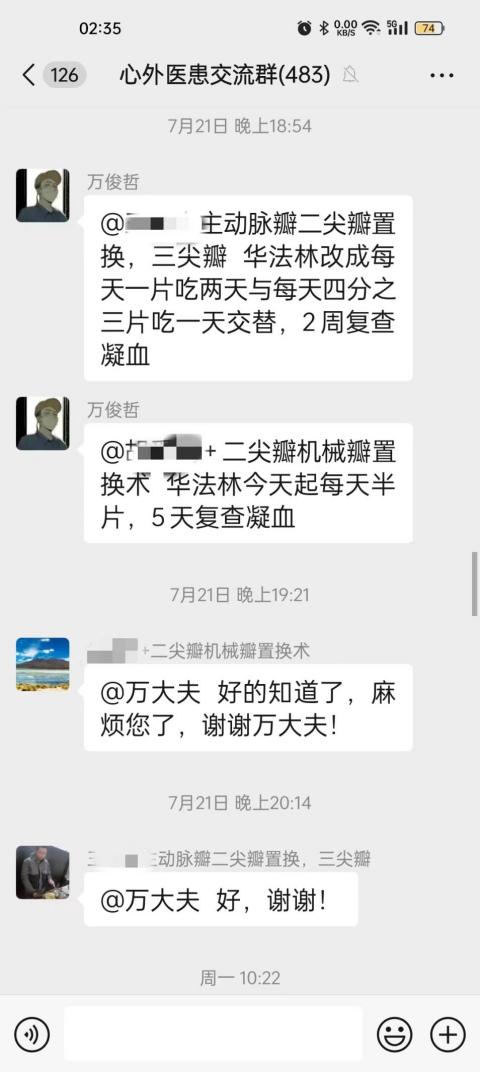 近年来,心血管外科对于瓣膜病的患者一直秉承全生命周期管理的理念。我们经常和瓣膜病人讲,手术成功顺利出院只是成功了一半,能否长期高质量生存,免除出凝血等并发症才是另一半。瓣膜术后口服抗凝剂需要定期抽血复查凝血,我们科室的大部分瓣膜手术患者家在外地,来我院复查十分不便,对患者和家属来说需要耗费时间,也增加了经济负担,造成部分患者长时间不查凝血,出现出凝血并发症的惨痛教训。心血管外科医护人员急患者所急,千方百计为患者排忧解难。借助微信工具,我们建立瓣膜手术患者随访群,每个术后患者出院时都会扫码进群,迄今入群患者逾千人,我们的医生利用手术之余,牺牲休息时间,无尝在群内帮患者解读在当地医院复查的凝血结果,指导患者调整用药,同时也宣讲术后心脏康复知识,回复患者的各种健康问题。通过微信随访群,我们对瓣膜病手术患者进行全生命周期管理,极大的方便了患者,免除了患者的奔波之苦,也增加了患者用药以及复查凝血的依从性,降低了抗凝相关并发症的发生。我们的精心指导和无私奉献得到了广大患友的信任和赞誉。心血管外科团队在高峰主任的带领下将继续秉承全生命周期管理的理念,应用最新技术手段,服务广大心血管瓣膜病患者,努力做好人民群众健康的守护者。