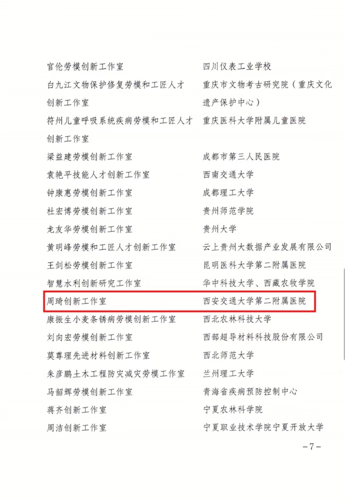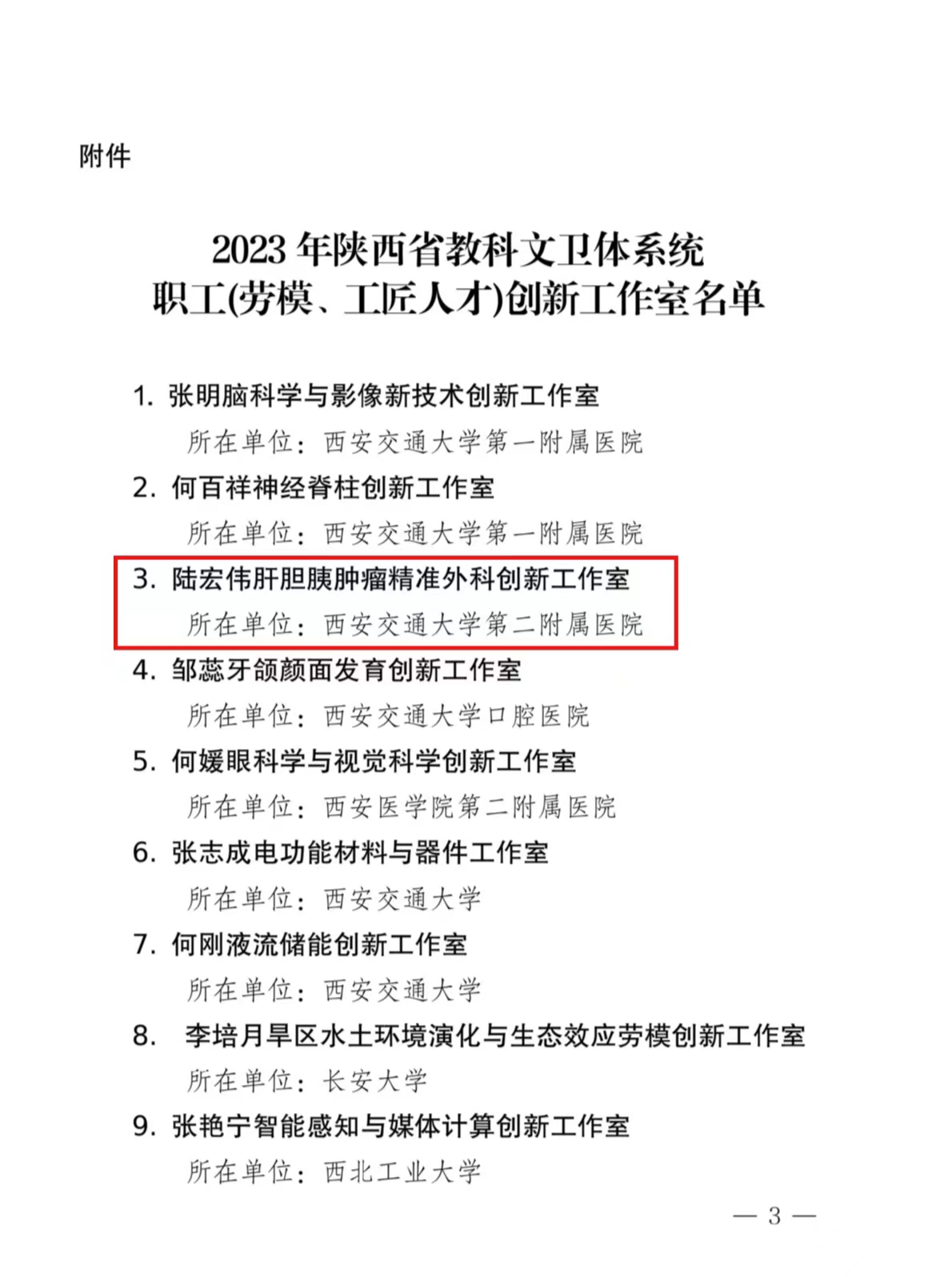 交大二附院全国职工创新工作室发挥示范效应,引领全院多科室多点位在创新赛道追赶竞优。近日,陕西省教科文卫体系统职工创新工作室命名决定公布,交大二附院陆宏伟肝胆胰肿瘤精准外科创新工作室荣列榜单。这是我院在该领域内被命名的第二个省级创新工作室,此前我院周琦创新工作室在获得陕西省教科文卫体系统(劳模和工匠)创新工作室的基础上,今年八月被命名为全国教科文卫体系统示范性劳模和职工创新工作室。