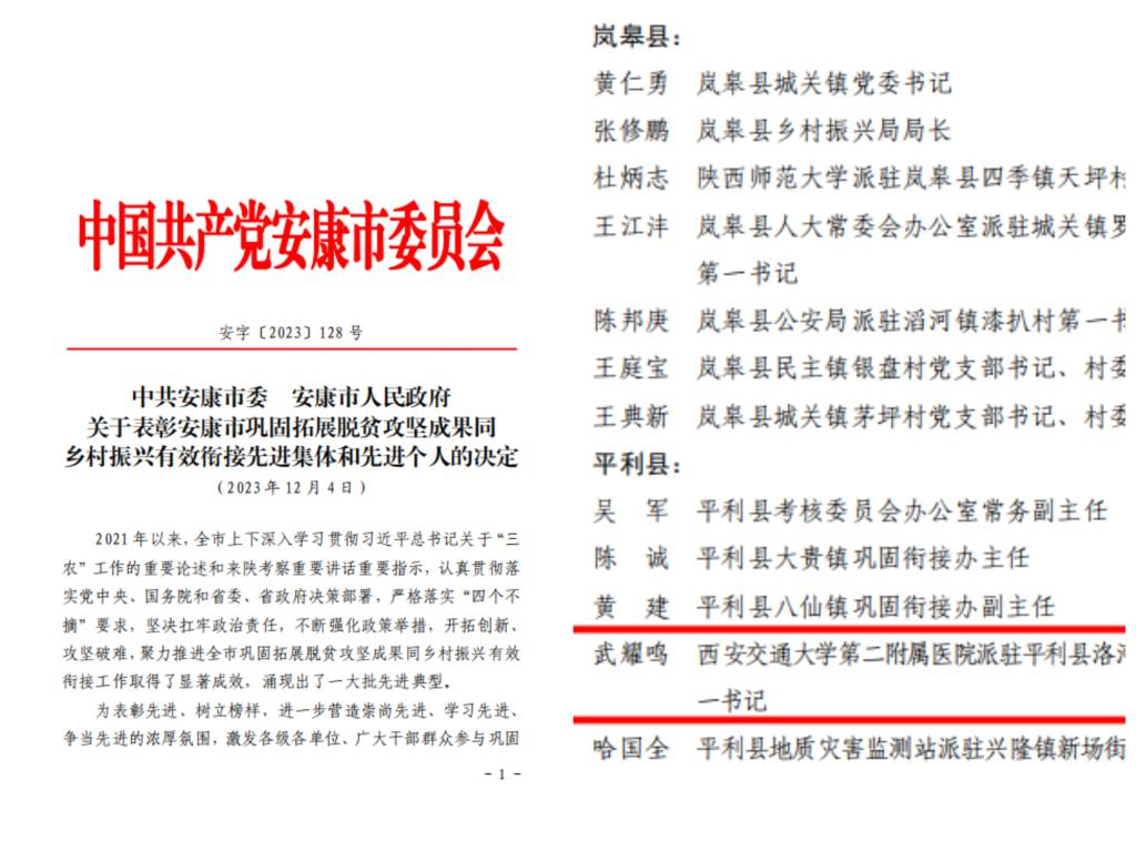 根据2023年12月4日由安康市委市政府下发的《关于表彰安康市巩固拓展脱贫攻坚成果同乡村振兴有效衔接先进集体和先进个人的决定》(安字〔2023〕128 号)文件精神,我院派驻安康市洛河镇水坪村驻村第一书记武耀鸣同志荣获安康市巩固拓展脱贫攻坚成果同乡村振兴有效衔接“先进个人”,是西安交通大学派驻安康市平利县9支驻村工作队中唯一获得此项荣誉的第一书记,也是继武耀鸣同志获得由陕西省委组织部等4部门联合评比的2022年度省派单位帮扶工作个人考核“优秀”等次后的又一项殊荣。