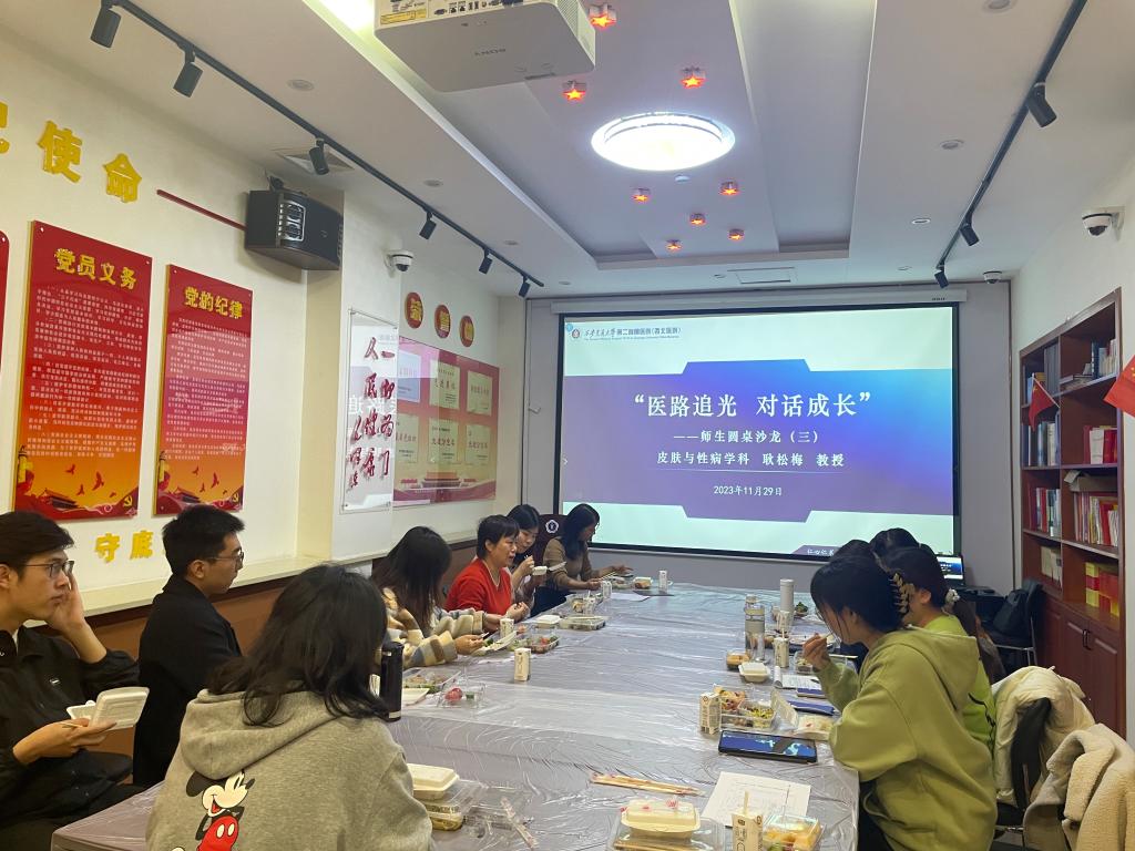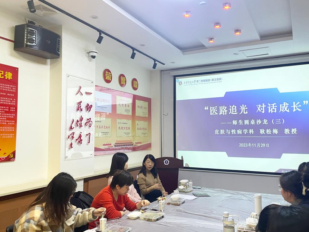 在庆祝我院成立86周年之际,学工部推出“医路追光,对话成长”师生圆桌沙龙系列活动。第三期师生沙龙于11月29日中午在党员之家举办,邀请了我院皮肤病与性病学科的耿松梅教授作为主讲嘉宾,为同学们介绍了皮肤病与性病学科的学科历史与现状、学科特色、科研成就以及未来发展方向等方面进行了宣讲,同时邀请了刘平副教授对教学工作进行了详细介绍,并为同学们答疑解惑。