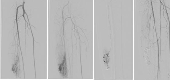 患者因右小腿疼痛不适两个月入院,查体右侧小腿中段可触及大小约5cm左右的肿块,质软,局部皮温增高,皮肤颜色未见改变,无明显压痛。下肢彩超考虑动静脉畸形,DSA下行下肢动脉造影后确诊为下肢动静脉畸形,由于洛阳市中心医院还未开展下肢动静脉畸形无水乙醇硬化和栓塞的技术,遂请求我院帮助。