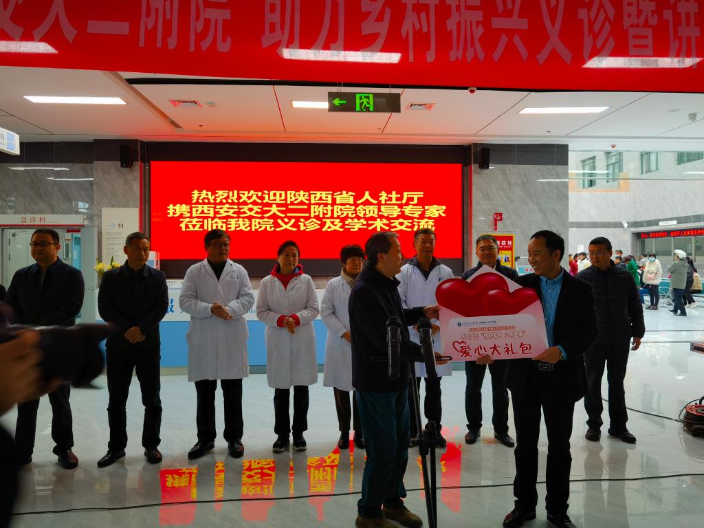 18日上午,在丹凤县医院启动专家团义诊仪式,西安交通大学第二附属医院向县医院赠送了“爱心大礼包”。