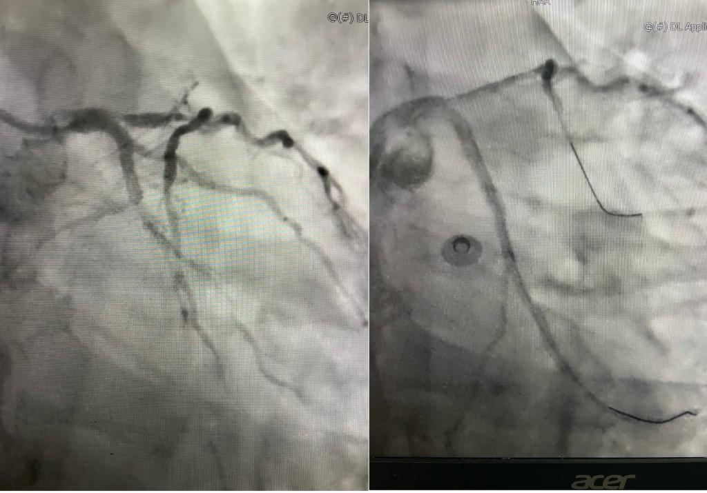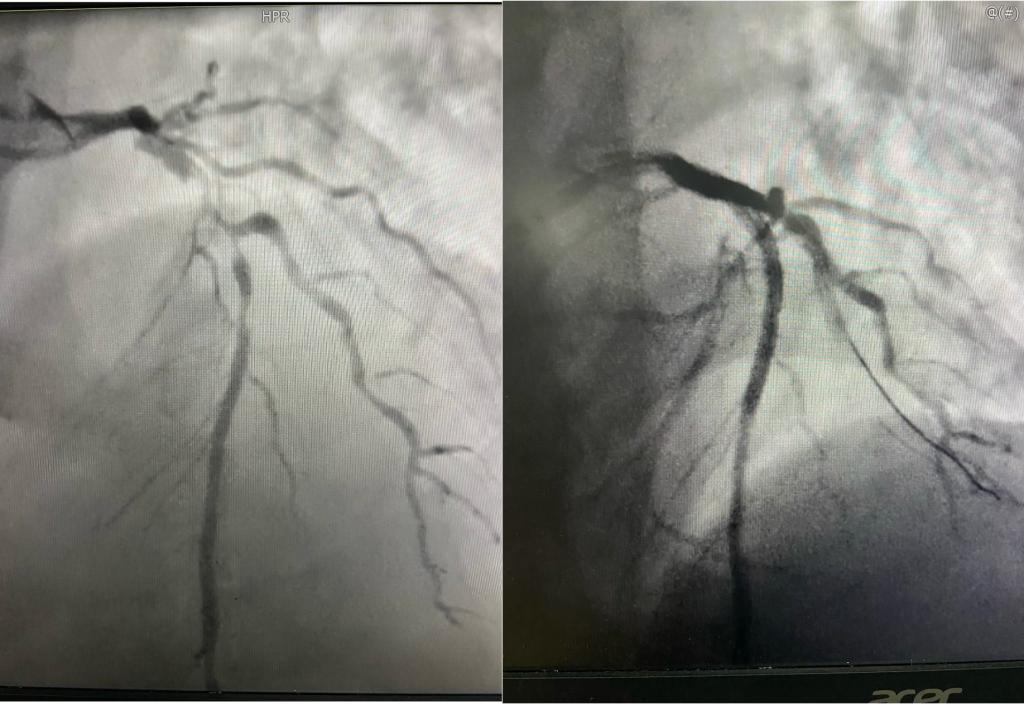 董新主任医师团队与急诊科ECMO团队充分讨论、与家属积极沟通后,决定在ECMO+IABP支持下行PCI术。在充分的备血、备白蛋白、药物维持血压等术前准备后,11月13日,急诊科裴红红主任医师调派ECMO团队内经验丰富的组员,携ECMO设备在最短时间抵达导管室,再次与董新主任医师、邓捷主任医师的手术团队确认手术方案、操作细节与流程,制定应急预案。14:00,VA-ECMO顺利运转。随后邓捷主任医师带领张明医师、苏力德医师开始实施PCI术。14:26导丝到达前降支、回旋支远端,14:30回旋支2个支架顺利释放,14:33前降支2个支架顺利释放,术中无并发症出现。看着射线下因为重新得到血流灌注而鲜活起来的心影,所有人悬着的心放下了一半。为保障ECMO顺利撤机、进一步帮助术后患者心功能恢复,植入IABP为围术期继续保驾护航。术后患者未诉不适,生命体征平稳,感染、血细胞破坏、下肢动脉缺血等术后并发症未见出现。不日,患者将好转出院。