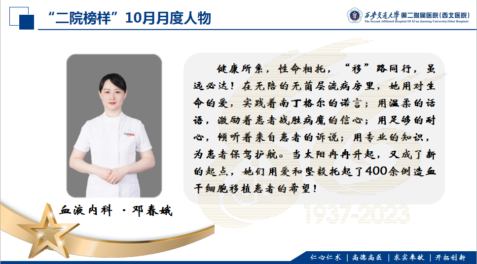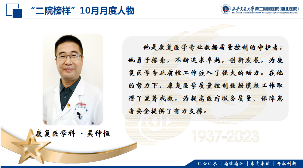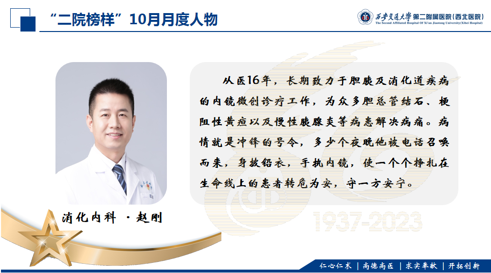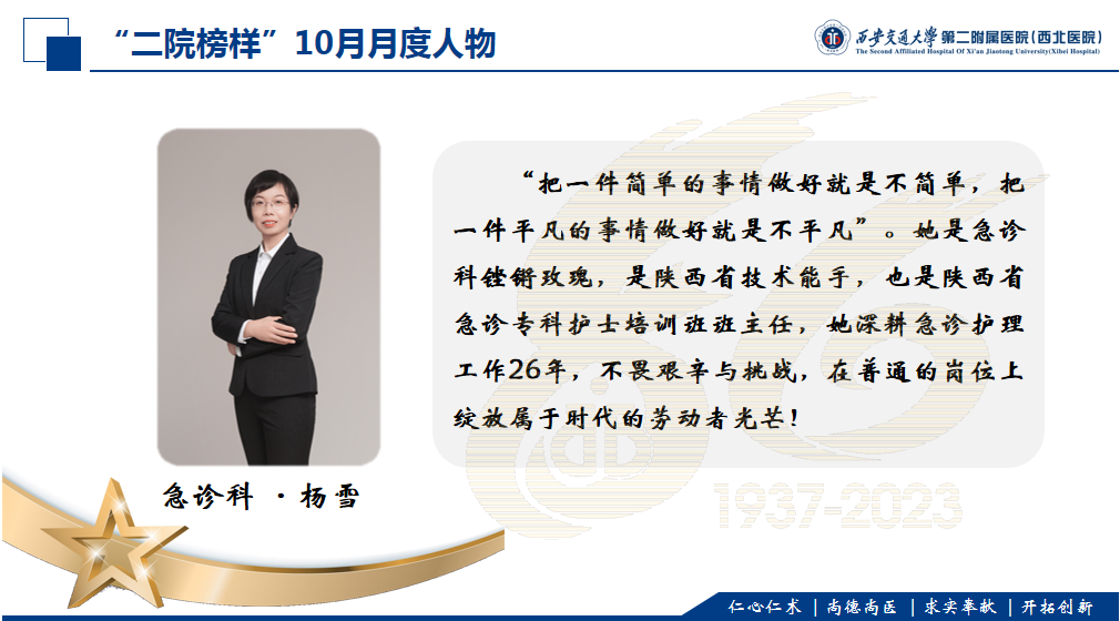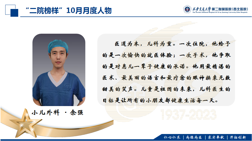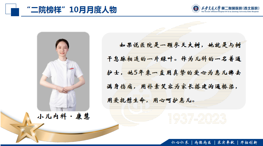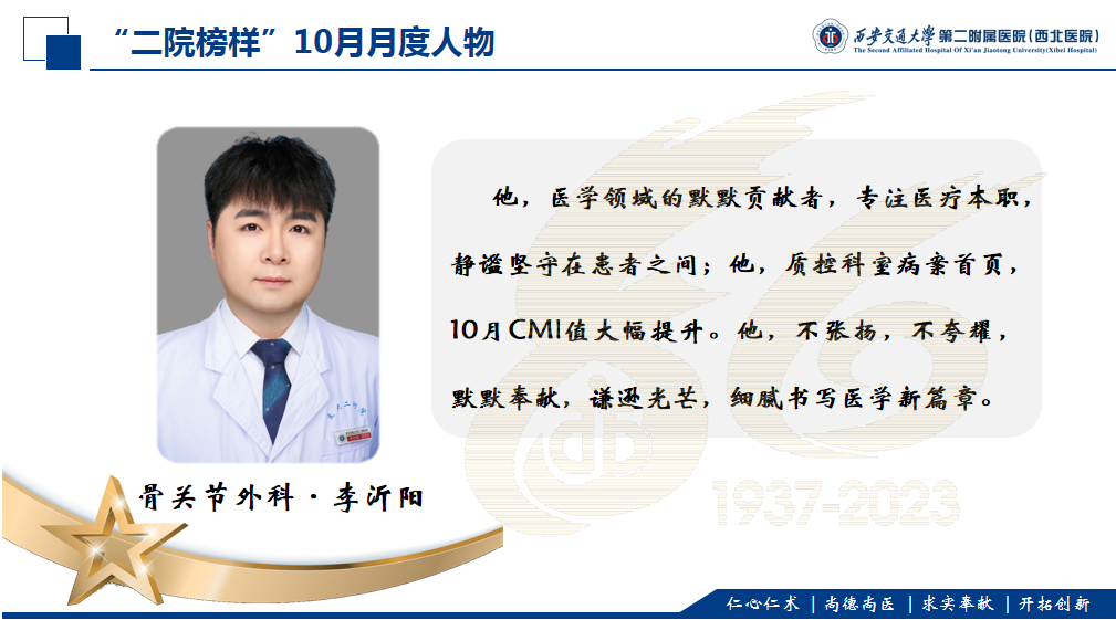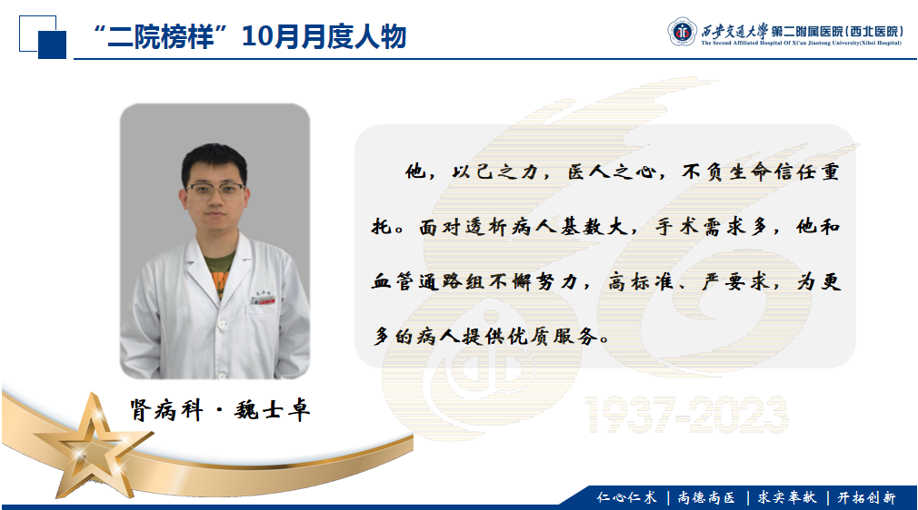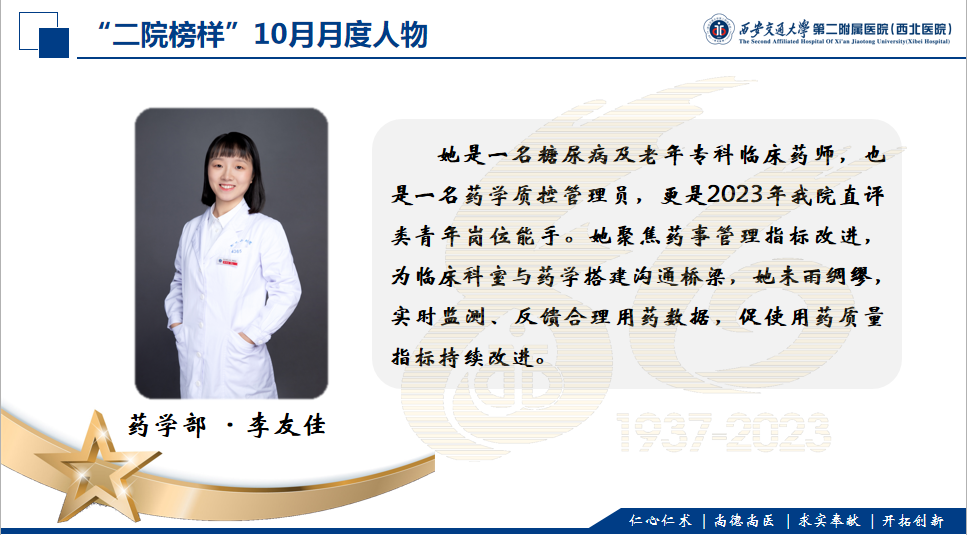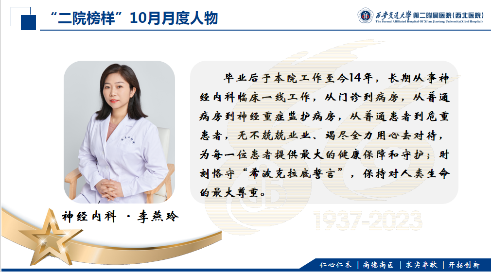 本次评选主要围绕医院中心工作,以国考指标、工作业绩为导向,经过对医疗指标的量化分析,抓取核心数据,共评选产生了“二院榜样”10月月度人物10名。他们分别是:神经内科主治医师李燕玲、小儿外科主治医师余强、消化内科副主任医师赵刚、肾病科住院医师魏士卓、骨关节外科住院医师李沂阳、药学部主管药师李友佳、康复医学科副主任医师吴仲恒、急诊科主管护师杨雪、小儿内科护士康慧、血液内科主管护师邓春娥。