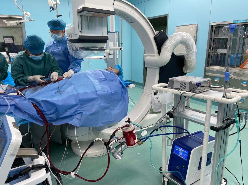 2023年11月13日13:00,急诊科裴红红主任调派ECMO团队经验丰富的4人小组,携ECMO设备在最短的时间抵达导管室,再次与董新教授、邓捷教授的手术团队确认手术方案、操作细节与流程,制定应急预案。14:00 ECMO团队以V-A转流模式(静脉动脉模式)顺利运转起来。随后,心内科邓捷教授团队很快进行多根导管冠脉动脉造影+PCI手术,整个过程行云流水,术中患者血压下降时及时调整ECMO辅助流量后很快改善,患者全程神志清楚,无相关不适,在VA--ECMO下患者血氧饱和度维持于95%以上,血压100/60mmHg,术后ECMO逆流辅助下生命体征无异常波动,考虑患者基础心功能太差,手术团队同时置入IABP辅助后顺利撤除ECMO,全程约一个小时左右,患者危急情况得以缓解,转入CCU继续观察。