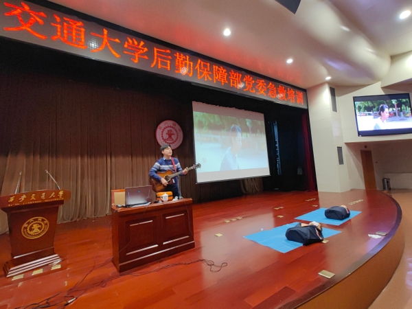 秋冬季节是急性心肌梗死的高发期,服务全校师生的一线员工们学习热情高涨。范博渊以近年来心血管疾病的相关数据引出相关疾病的病因、症状及疗法,强调了心肺复苏术的重要性,展示了AED的操作,并通过吉他弹唱原创歌曲《心肺复苏之歌》,将动作要领融到歌词曲调中,带领大家一起练习心肺复苏术的实操技巧。讲座后,教职工们进行了一场急性心梗应急全流程演练,通过反复操作进一步提高了对应急救护知识的掌握。