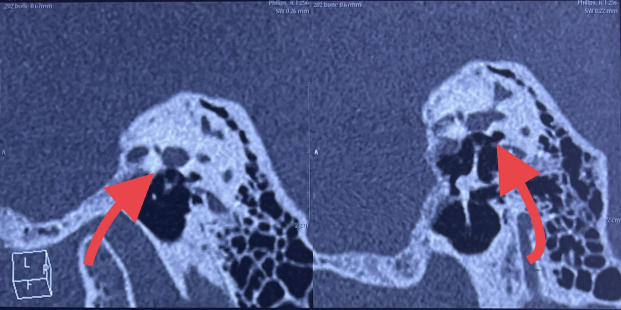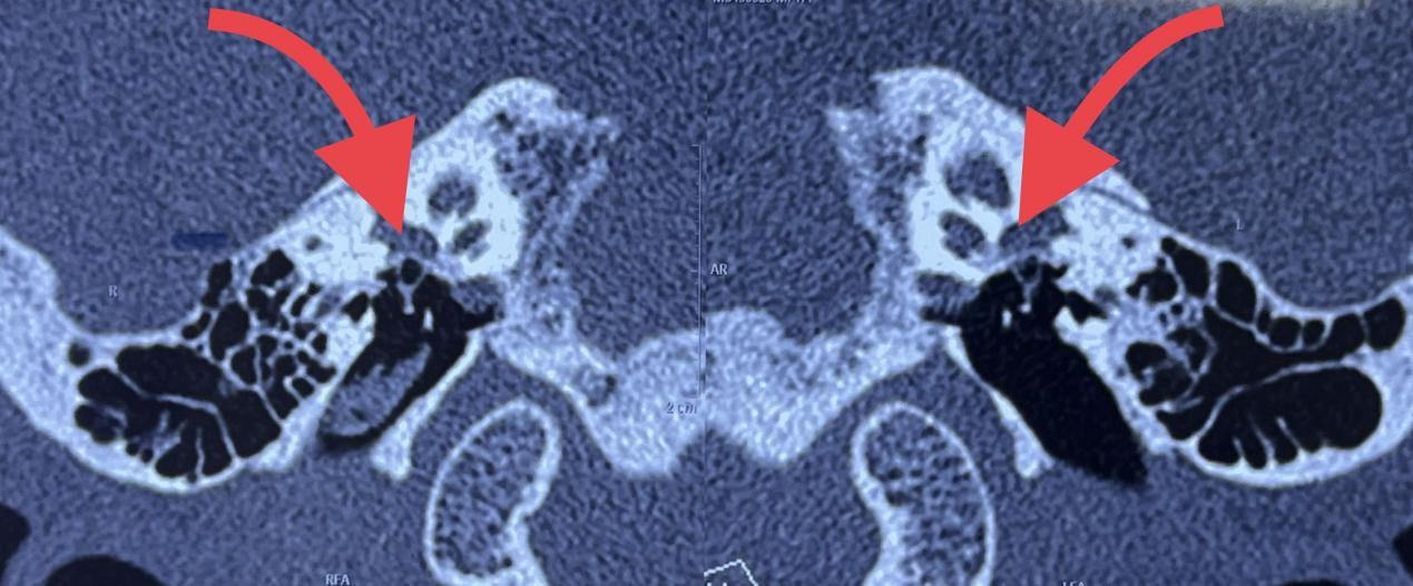 病例2:郭某,女,35岁,主诉:双耳进行性听力下降半年,纯音听阈测定:双耳传导性聋,耳内镜:双耳鼓膜完整,听骨链CT三维重建示双耳耳硬化症。