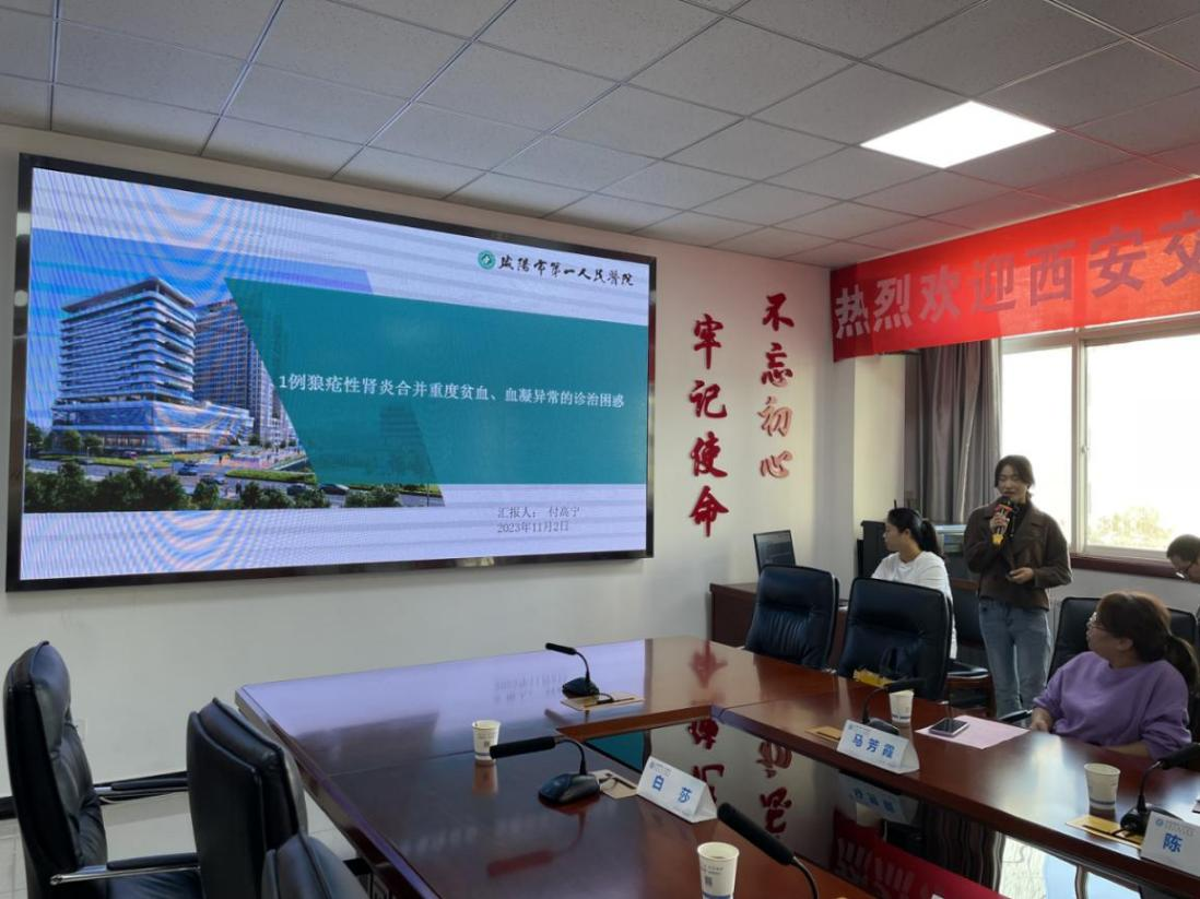同时针对咸阳市第一人民医院肾病内科两名医生汇报的《1例重症ANCA血管炎肾损害合并抗GBM病历分享》和《1例狼疮性肾炎合并重度贫血,血凝异常诊治困惑》进行学术交流。