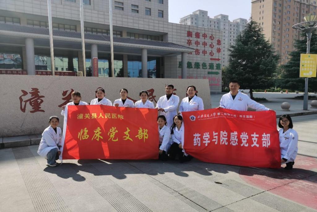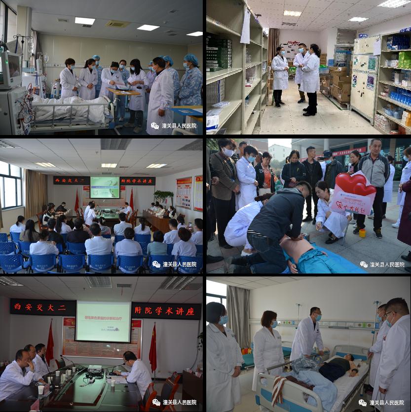 普外科张立副主任医师、肾病内科卢家美副主任医师、呼吸内科张伟医师等多名专家深入科室进行了教学查房,对疑难病例进行透彻分析,精心指导。普外科李杰副主任医师为医务人员作:《结直肠癌的外科管理》,肿瘤科张寅斌副主任医师作:《黑色素瘤的诊疗常规》,内分泌科董鹏副主任医师作:《糖尿病酮症酸中毒》,生物诊疗中心朱鹏鹏助理研究员作:《宏基因组二代测序(mNGS)在感染性疾病中的应用与展望》等学术讲座。丁抗宁总护士长在门诊楼前,为前来就医的群众现场讲解徒手心肺复苏的适应症和禁忌症、操作步骤、动作要领及注意事项,并指导群众实操练习。药学部党支部与潼关县人民医院临床党支部开展了党支部共建活动,参观了县医院药房,并对提高药事管理和提升医院合理用药水平进行了深入交流,为未来紧密联系开展帮扶工作打下了坚实基础。
