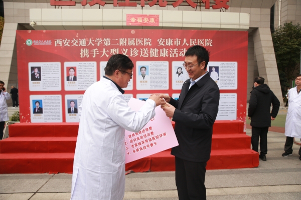 工会主席陈海文代表我院向安康市人民医院赠送了“免收进修费、培训费、等级医院评审指导、为上转病人开辟绿色通道、赠送200张免挂号费爱心卡”的大礼包,帮助和支持安康市人民医院的人才培养和技术提升,满足广大安康人民的健康需求。