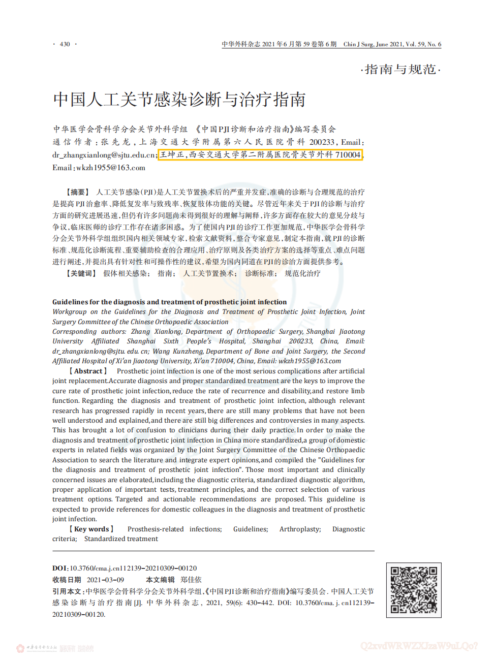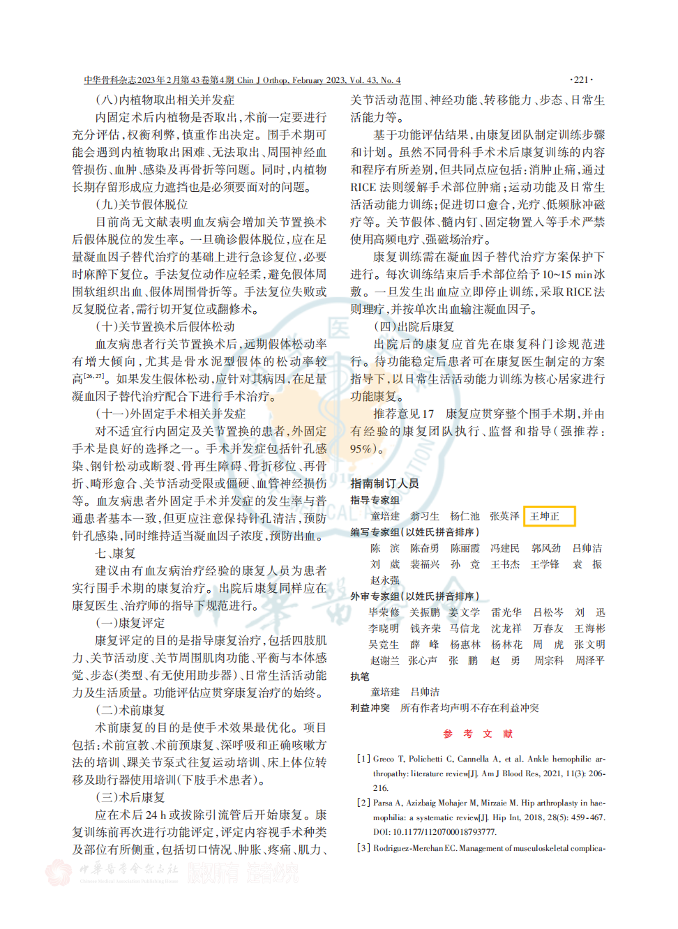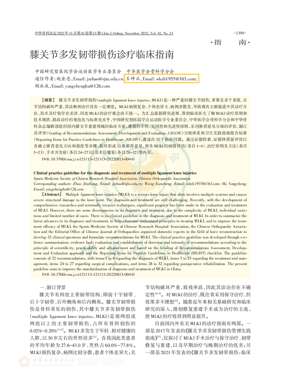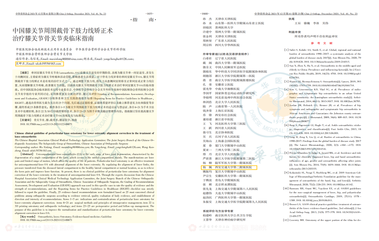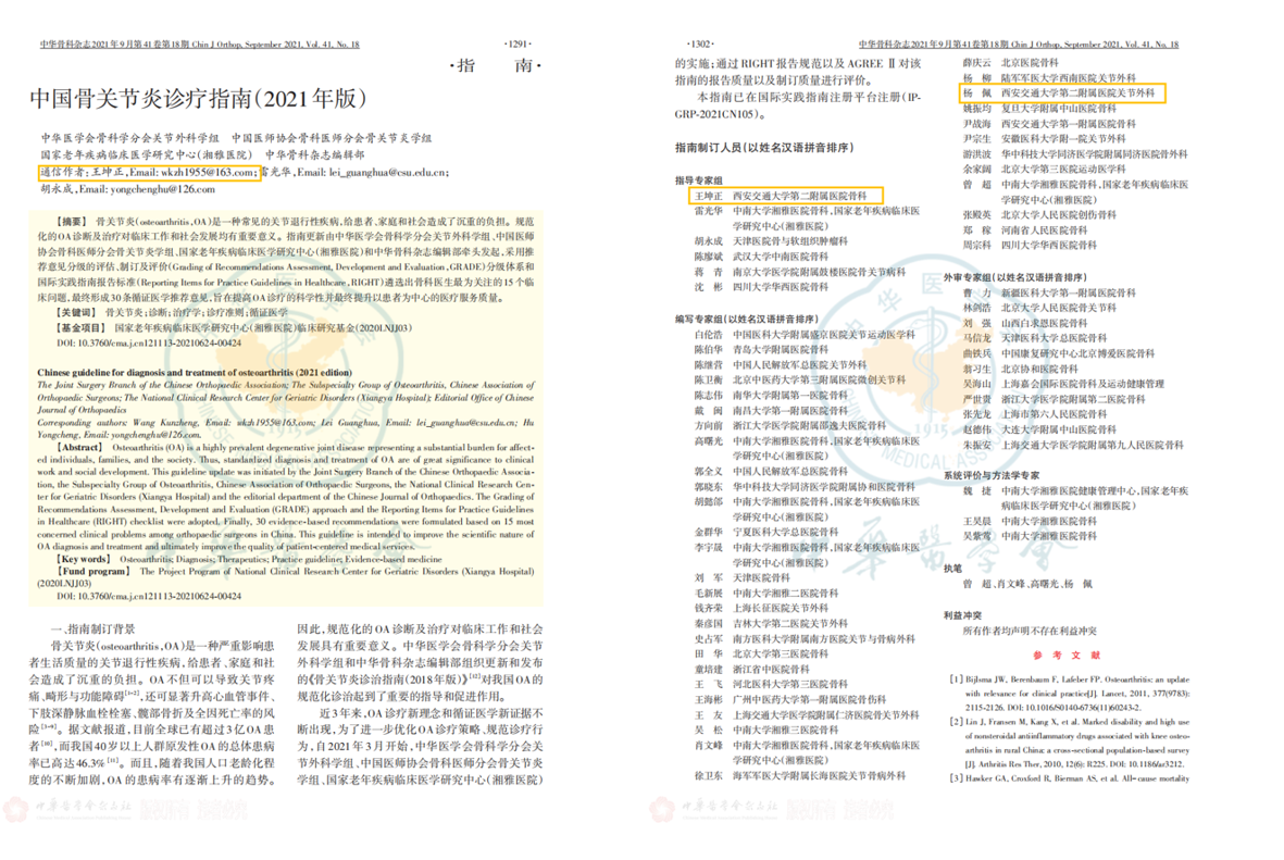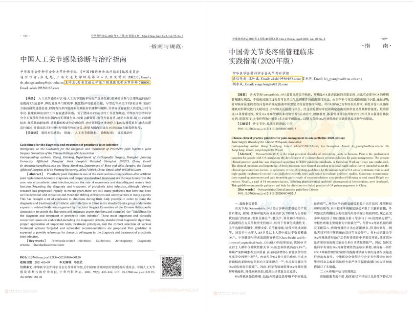 近3年来,由我院王坤正教授作为通讯作者牵头,骨关节外科多名医生参与制定或执笔的行业指南有十余部,其中包括:《骨关节炎诊疗指南(2021年版)》、《中国骨关节炎疼痛管理临床实践指南(2020年版)》、《中国成人股骨头坏死临床诊疗指南(2020)》、《中国髌股关节骨关节炎诊疗指南(2020年版)》、《中国人工关节感染诊断与治疗指南》、《中国膝关节周围截骨下肢力线矫正术治疗膝关节骨关节炎临床指南》、《膝关节多发韧带损伤诊疗临床指南》、《中国血友病骨科手术围手术期管理指南》、《中国发育性髋关节发育不良诊疗指南(2023版)》等。这些指南在遵循科学性、实用性和先进性原则上不断更新,细化诊疗过程,优化诊疗策略,反映新时代手术治疗的新理念和循证医学进展,为广大临床骨科医师提供科学、可行的治疗规范骨科医生诊疗行为。