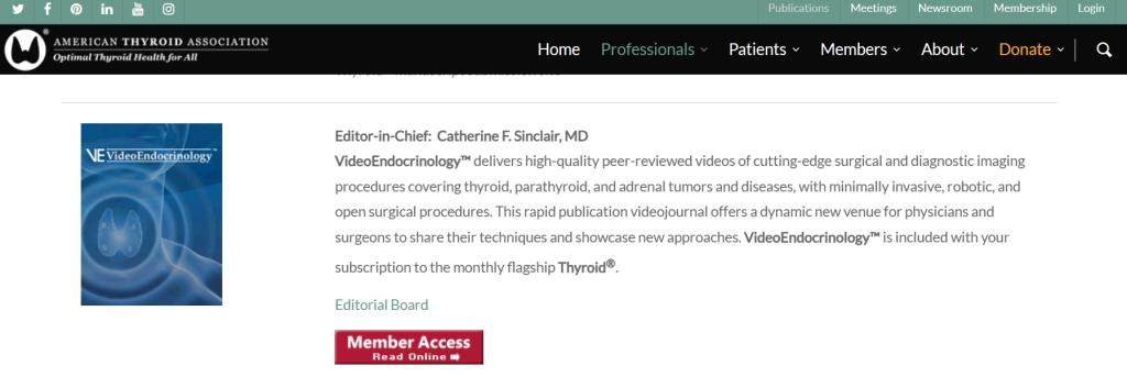 美国甲状腺学会(ATA)是全球甲状腺领域知名度最高、最古老的的甲状腺专业学会,迄今已有一百年历史。《视频内分泌》则是该学会的会刊之一,其另一本会刊《甲状腺》(《Thyroid》)则是甲状腺亚专业领域影响力最高的杂志之一。与《甲状腺》杂志不同,《视频内分泌》提供高质量的同行评审视频,介绍尖端的内分泌领域外科操作和诊断成像技术。并作为美国继续医学教育项目(CME)内容之一,面向美国住院医师及甲状腺领域医师,介绍甲状腺领域最新的、以及标准化的示范操作技术。
