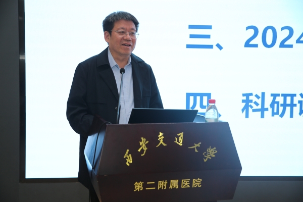 西安交通大学科研院副院长马现仓对我院的科技大会给予肯定,他代表学校和医学部对我院科技工作者表示致敬和感谢,他指出二附院在2023年国科金工作中打了场大的胜仗,30%的增长率达到了历史新高。他强调在2024年申报工作中医学部要求医院的领导和科主任带头申报,加大对重点项目、人才项目、国际合作交流项目的部署,一定要做有组织的科研,各学科要凝练方向,发扬特色,加强建设,“在一毫米的距离上扎下去一千米”。他总结“没有偶然的成功,所有的成功背后都有必然”,成绩背后是二附院对国科金申报工作的精心布置,辛勤付出,精益求精,二附院在刘昌书记带领下有着好的态势,期待明年在座的科技人员心想事成。