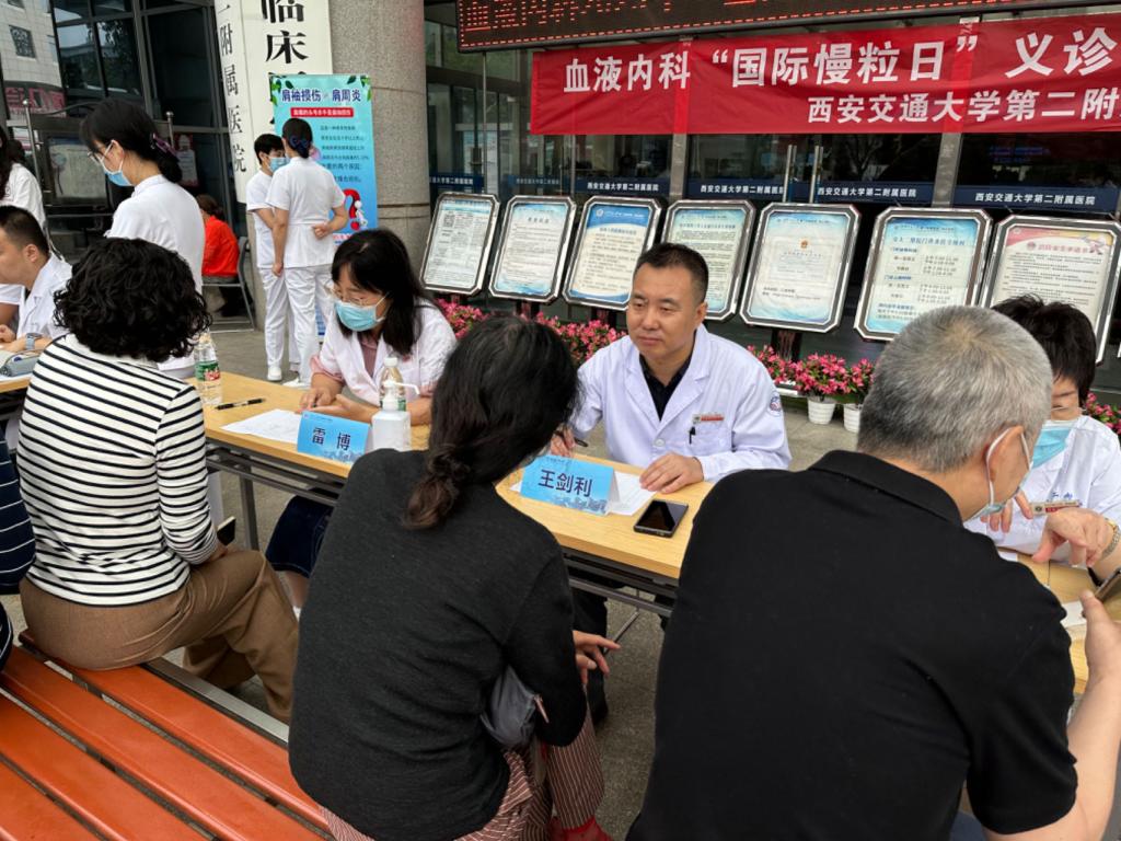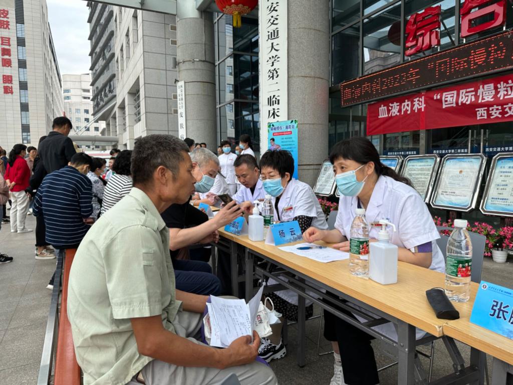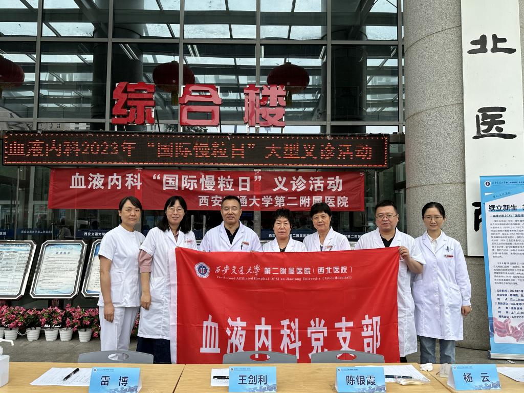 今年9月22日是第13个国际慢粒日。为提高公众对“慢性粒细胞白血病”的重视,普及相关知识,促进患者对慢性粒细胞白血病规范化诊疗重要性的了解,西安交通大学第二附属医院血液内科陈银霞主任医师、杨云主任医师、王剑利副主任医师、张鹏宇副主任医师、雷博副主任医师于9月22日上午在门诊楼前举办了2023“国际慢粒日”大型义诊活动,为超过50名患者提供了线下义诊服务。