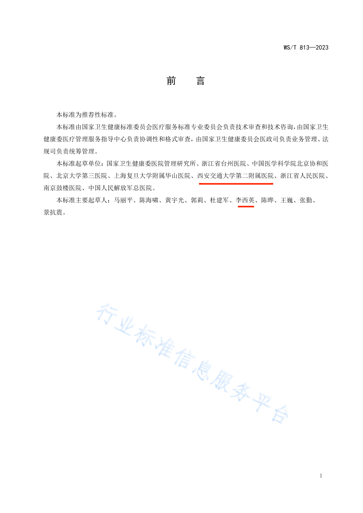 9月11日,我院参与制定的行业标准《手术部位标识标准》(WS/T 813-2023)正式发布,医疗质量控制办公室李西英主任为主要起草人之一。