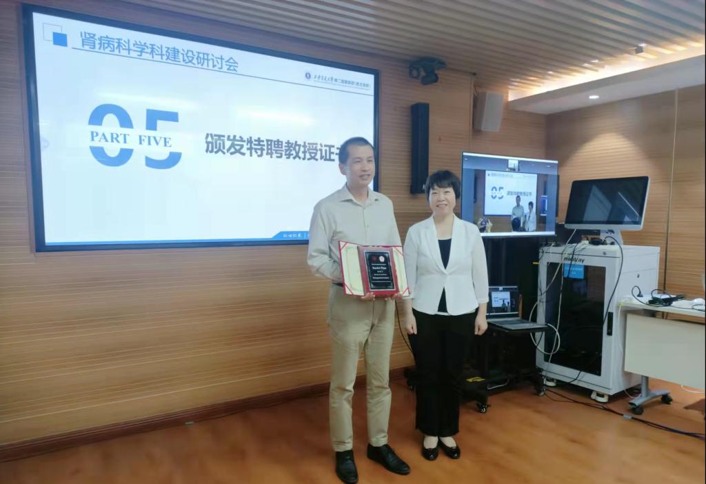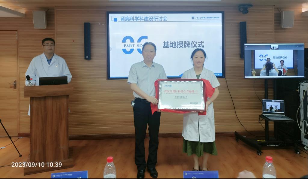借本次会议,党变玲副书记代表医院为田雪飞教授颁发特聘教授证书,滕文葆副书记代表西安市科技局为肾病科主持西安肾脏与危重症国际合作基地揭牌仪式。