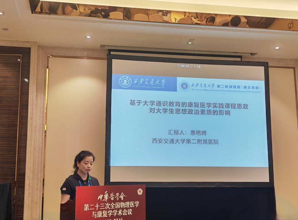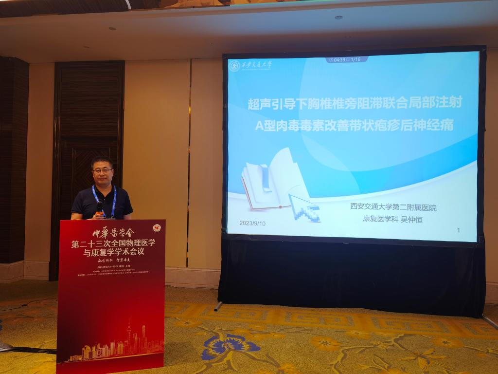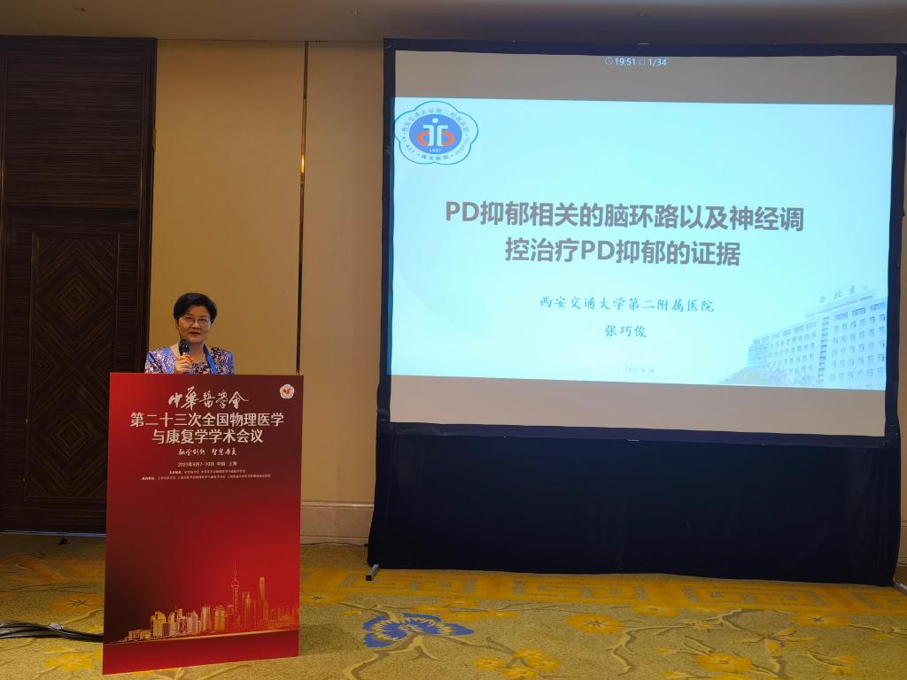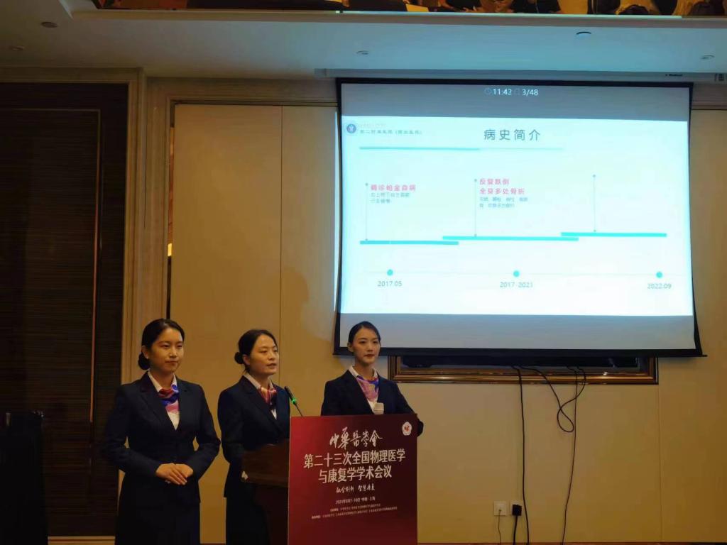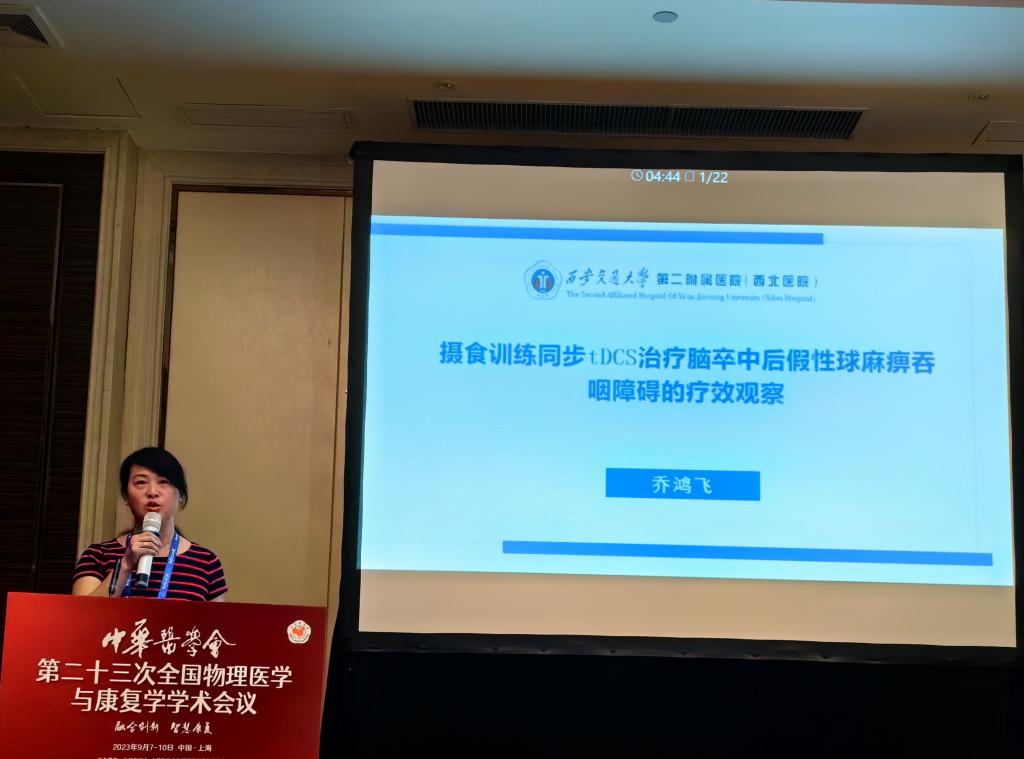 我院康复医学科7人组团参会并进行大会交流,共有1人大会专题发言,1人担任大会专题主席,1人大会论坛主持,4人口头发言,3人病例汇报,1人电子壁报展示。康复科主任张巧俊教授受邀在神经康复论坛进行了《帕金森病抑郁相关脑环路以及基于环路的神经调控》的专题发言,同时还主持康复评定论坛,担任康复病例论坛主席。乔鸿飞教授在言语认知与吞咽康复论坛进行了《摄食训练同步经颅直流电刺激治疗脑卒中后假性球麻痹吞咽障碍的疗效观察》的口头发言;吴仲恒教授在医院管理/学科建设论坛进行了《陕西省综合医院康复医疗资源现状与服务能力调查报告》的口头发言,同时在神经康复论坛进行了《超声引导下胸椎椎旁阻滞联合局部注射A型肉毒毒素改善带状疱疹后神经痛》的口头发言。惠艳娉教授在康复教育论坛进行了《基于大学通识教育的康复医学实践课程思政对大学生思想政治素质的影响》的口头发言;张慧主管治疗师在康复治疗技术进行了《tDCS同步OT在脑卒中患者上肢运动功能障碍中的临床应用研究》的口头发言。由王玲、高鑫、王彬凡组成的代表队在康复病例讨论中汇报《晚期帕金森病险象环生康复1例》。