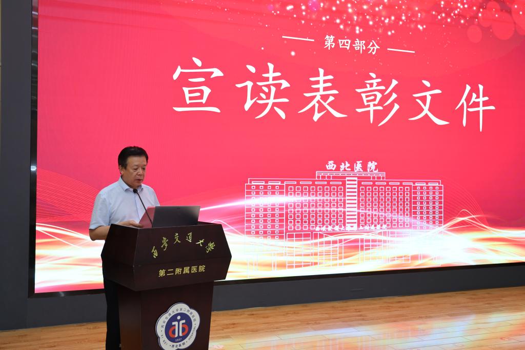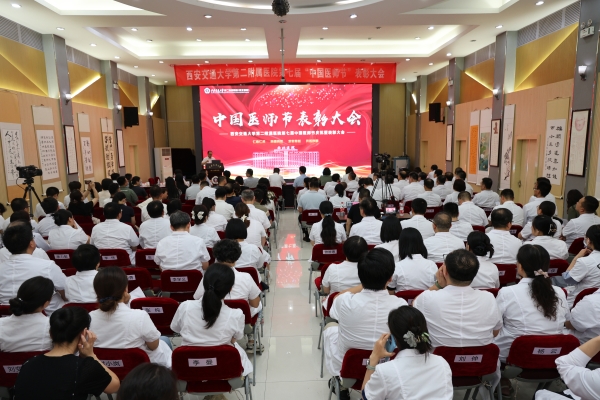 为隆重庆祝第七个中国医师节,营造重医、尊医、崇医的良好氛围,8月19日下午,西安交通大学第二附属医院隆重举行第七届中国医师节庆祝暨表彰大会。陕西省卫生健康委员会赵文二级巡视员,陕西省教科文卫体工会徐富权主席,西安交通大学医学部孟晓军副主任,陕西省卫生健康委员会医政处朱爱侠二级调研员,西安交通大学医学部医院管理处谭婷副处长,院党委书记刘昌及全体领导班子成员,各职能部门负责人,优秀医师代表300余人参加了大会。会议由医务部王虎清常务副主任主持。
