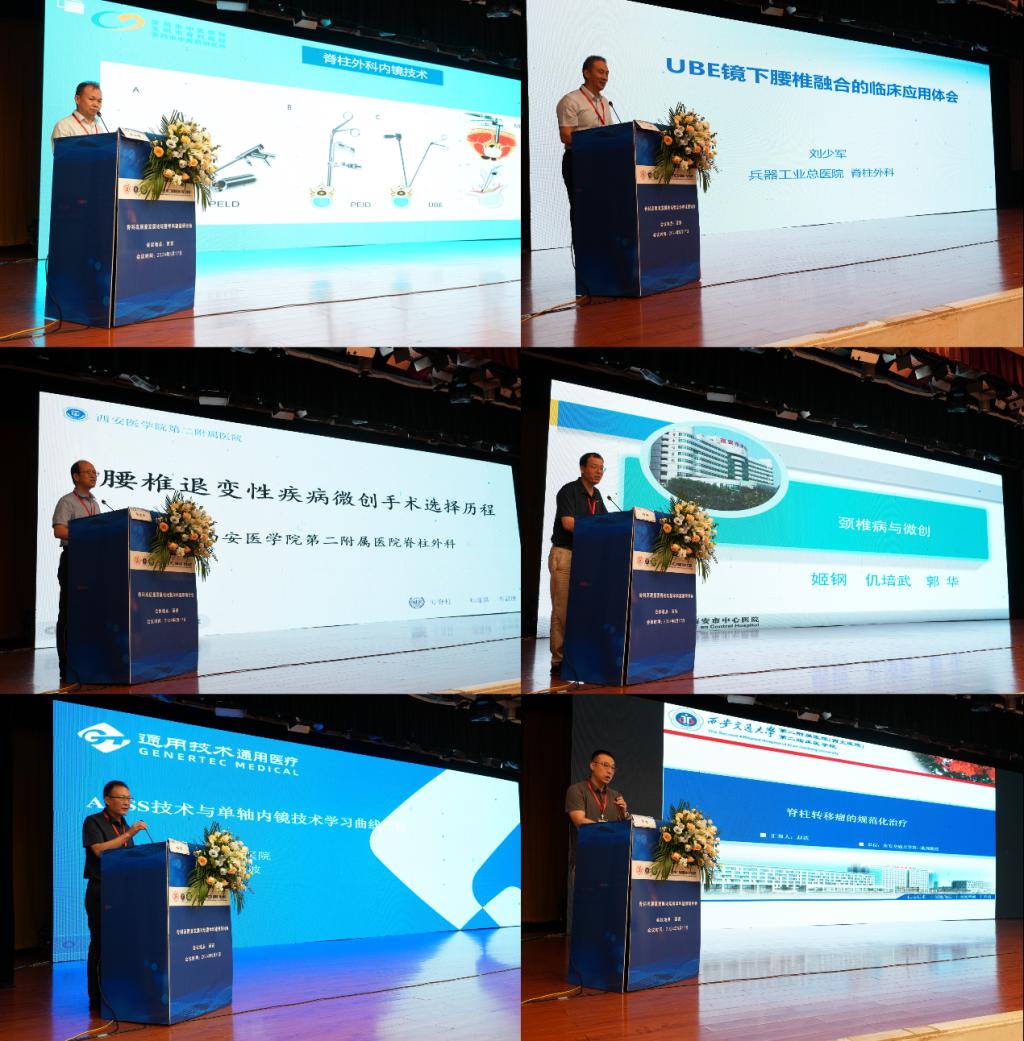 随后,宝鸡市中医医院王小明教授《AUSS技术的临床观察与科研方向》、兵器工业总院刘少军教授《UBE在腰椎退变性疾病中的应用》、西安医学院第二附属医院郝世渊教授《腰椎退行性疾病微创手术治疗选择》、西安市中心医院姬钢教授《颈椎病与微创》、汉中市3201医院《AUSS技术与椎间单轴内镜技术应用比较》、西安交大二院赵波教授《椎体转移性肿瘤的治疗原则》进行学术报告。