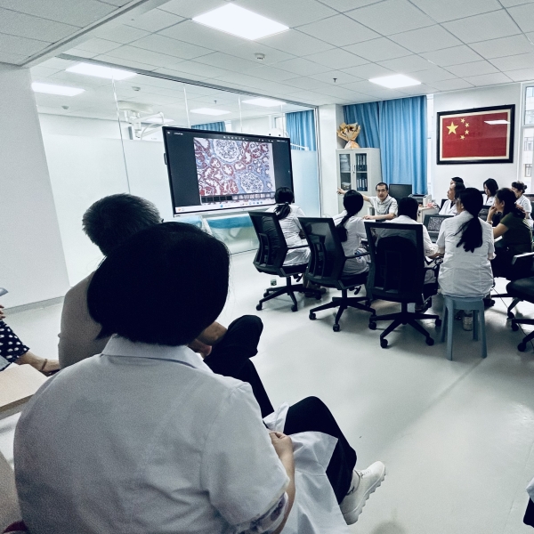 系列活动于9月8日上午7点30分开始,首先在肾病科示教室举办肾脏病理临床CPC,由肾病科主任付荣国教授主持,全体医师及在读博士、硕士参加。田雪飞教授对4例当周进行的肾穿刺活检标本病理进行深入解读,结合临床给予了治疗和随访的指导意见。上午9点,继续开展了题为“足细胞命运的新见解:衔接足细胞生物功能和理解蛋白尿性肾小球疾病”的知识讲座。田雪飞教授的讲座关注围绕近年来肾小球足细胞病变基础研究的热点问题,对引起大部分肾病综合征的病理基础核心进行了深入探讨,重新认识足细胞在肾脏疾病发生发展中的重要作用及其受损脱落方式,有希望为减缓蛋白尿性肾小球疾病进展提供潜在治疗靶点。