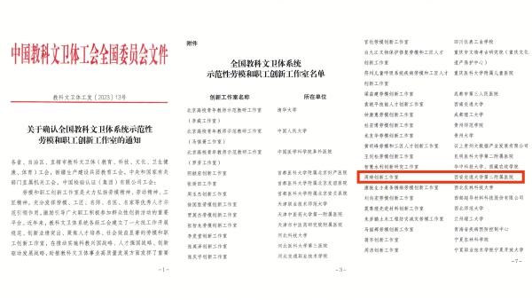 8月15日,中国教科文卫体工会全国委员会下发《关于确认全国教科文卫体系统示范性劳模和职工创新工作室的通知》(教科文卫体共发﹝2023﹞13号),我院周琦创新工作室荣获全国教科文卫体系统示范性劳模和职工创新工作室!周琦创新工作室于2020年9月由陕西省教科文卫体工会获批成立,工作室的建设立足于超声研究室现状及未来数字化、智能化的发展趋势,发扬优势传统,紧跟学科前沿方向,把握时机开展各种新技术,不断完善管理机制,扩大临床设备与基础研究规模,加强人才队伍梯队建设,提升辐射影响及推广能力,保持领先地位和可持续发展势头。
