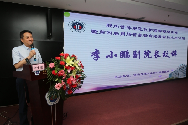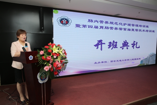 培训班开班仪式由消化内科护士长杨会主持,西安交大二附院副院长李小鹏、护理部副主任孔德玲、姚聪、全科医学科主任赵晓静、护理部丁抗宁、杨长虹、王秀莹、徐岁云总护士长等参加。全科医学科主任赵晓静在致辞中指出临床营养与治疗息息相关,营养专科护士目前非常紧缺,营养专科护理团队的缔造非常重要,并预祝培训班圆满成功;护理部副主任孔德玲表示肠内营养是患者的重要营养支持方式,因此对肠内营养相关知识培训、技能的学习和研究十分重要,并勉励大家,营养专科培训仅仅是开始,还需要学以致用,不断提高;副院长李小鹏肯定了我院营养护理专科小组自成立以来所做工作及取得的成绩,为省内外营养护理专科护理的发展提供了平台,为提高护理人员营养护理专科知识素养做出了努力,并预祝此次培训班圆满成功,希望营养护理专科小组工作继续再接再厉,培训班学员认真学习,推动营养护理专科护理技术的提高,并预祝大家在培训中缔结友谊,未来可期,在营养道路上不断求真、探索。