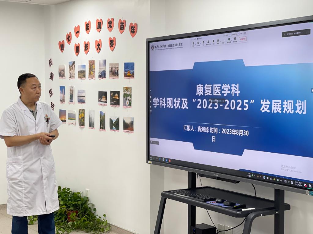 8月30日下午,在医院学科建设办的组织下,康复医学科在西门诊住院部七楼会议室召开“谋大局、开新局、建新功、全学科提升行动”学科建设研讨会,院党委书记刘昌教授、副书记党变玲、副院长戴一,总会计师李文博等院领导参会,同时参会的还有院党委委员何爱丽教授、学科办主任纪泛扑教授、医务部主任刘明教授,招采办主任孙颖哲、国装办主任叶泽宇、信息与网络中心主任陈鹏岗等领导。会议特邀中华医学会物理医学与康复学分会主任委员、中国康复医学会副会长、四川大学华西医院康复医学院院长何成奇教授,中国康复医学会副会长、首届吞咽障碍康复专业委员会主委、广东省康复医学会会长、中山三院康复科学科带头人窦祖林教授线上参会指导。