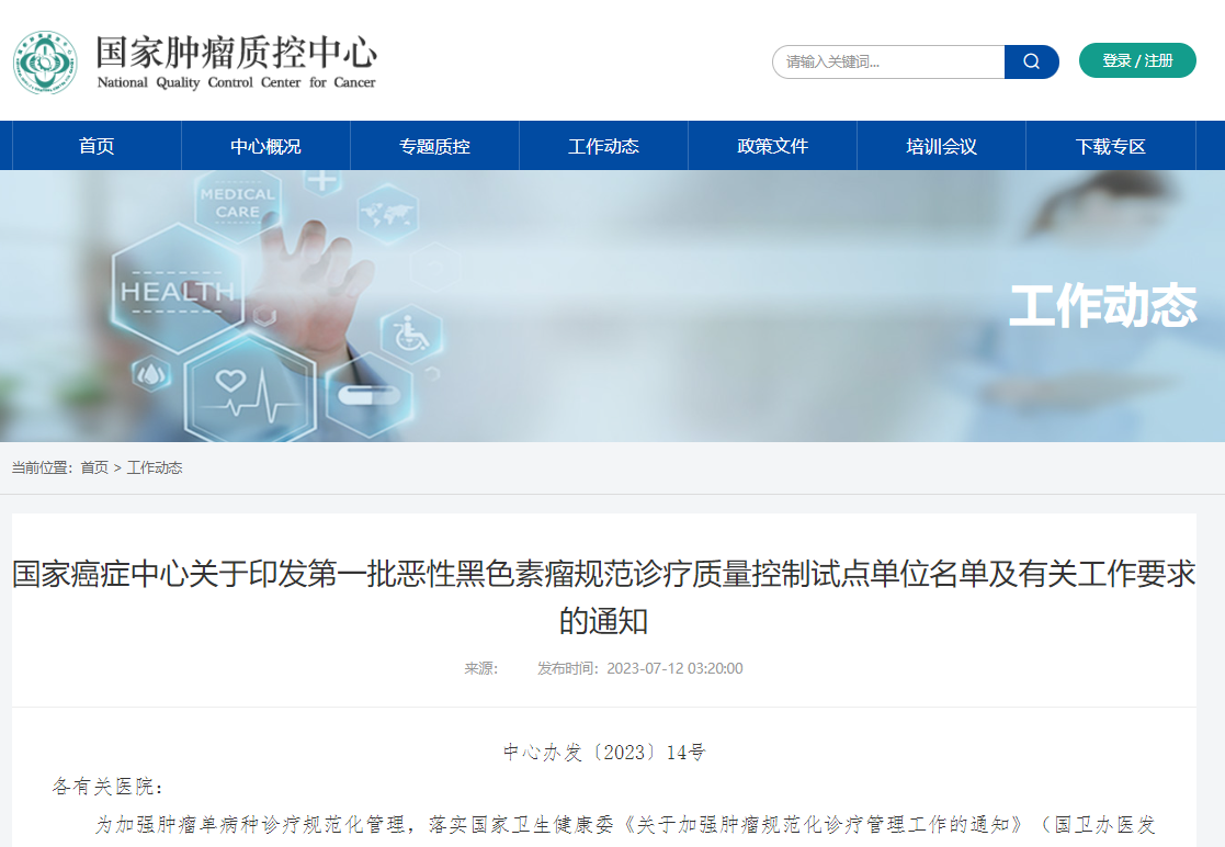 近日,国家癌症中心公布了第一批恶性黑色素瘤规范诊疗质量控制试点单位名单,我院成为首批“恶性黑色素瘤规范诊疗质量控制试点单位”之一。这标志着我院恶性黑色素规范诊疗质量得到了国家权威部门的肯定与认可。