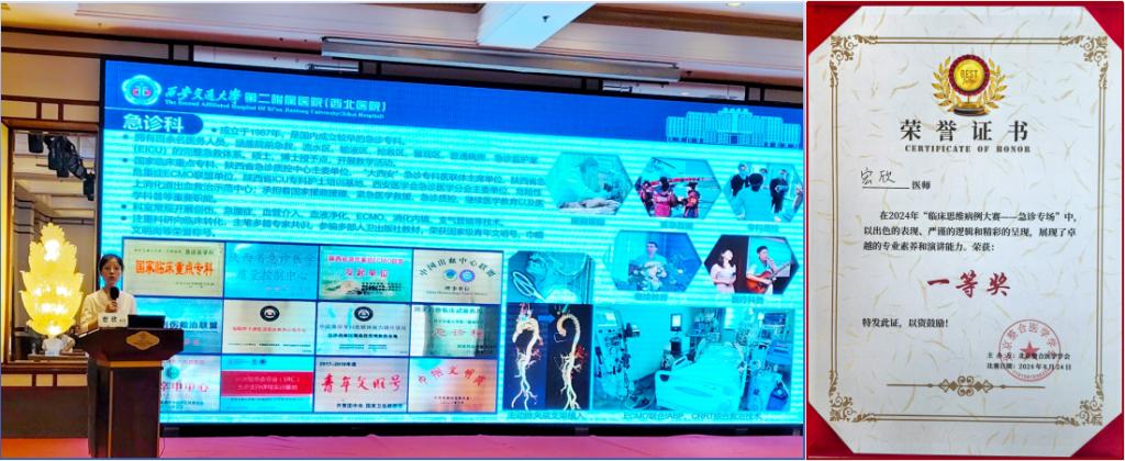 8月的古都长安热意燃燃,赛场的氛围也是火热激昂。评审团阵容豪华,均是急危重症业内领军人物,本着公平、公正、的原则对每位竞赛选手进行认真点评、专业提问、不吝指正。竞赛选手们是全国各省经初赛、复赛、决赛过五关斩六将产生的地区“第一名”突入本次决赛。西安交大第二附属医院急诊科宏欣医生以“魔肺护航,急速救心”为主题向大家汇报了一列急性广泛前壁心肌梗死所致心源性休克患者的救治案例。她以出色的表现、严谨的逻辑和精彩的呈现,展现了卓越的专业素养和演讲能力,荣获“一等奖”佳绩。