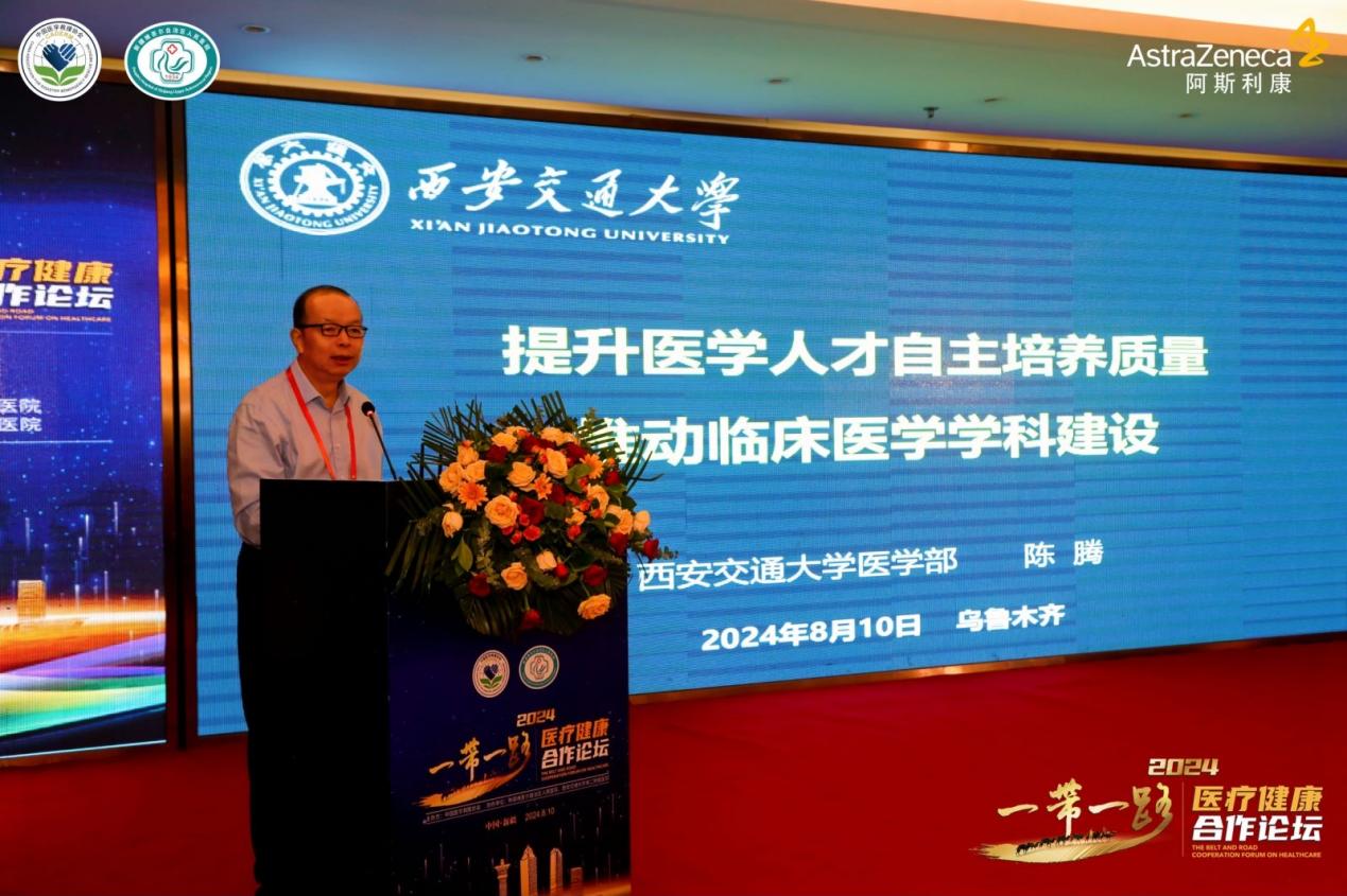 在2024年“一带一路”医疗健康合作论坛上,西安交通大学医学部党委书记陈腾作了《提升医学人才自主培养质量,推动临床医学学科建设》讲座, 讲解了医学人才自主培养的西交大实践,一是构建了沉浸式的理论与实践教学体系,基于案例研究学习的实验教学体系,以基础与临床融通为目标,不断完善优化器官/系统整合课程,建立融合型管理体制与机制,推进器官/系统整合课程教育体系建设;二是构建本硕博培养体系、“医学+x”研究生课程体系,建立学科交叉人才培养平台,探索Med-CDIO-T育人模式,创新医工交叉产教融合;三是强化立德树人为根本,思政案例库建设为着力点,政治素养、职业素养、科学素养、道德素养、文化素养、法治素养、心理素养为主题,不断提升教师课程思政意识和能力,全面提高医学学科人才培养能力。