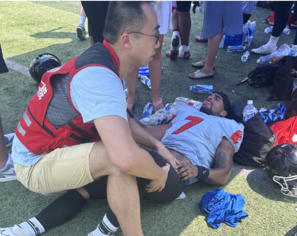 近日,西安云豹橄榄球队与武汉橄榄球队进行比赛,我院运动医学病区参与了医疗保障工作。当天气温较高,双方队员在剧烈的比拼中不可避免地出现受伤或脱水情况。赛前,医务人员对运动员如何预防运动性脱水进行科普。在比赛过程中,医护人员及时救治了多名受伤运动员。