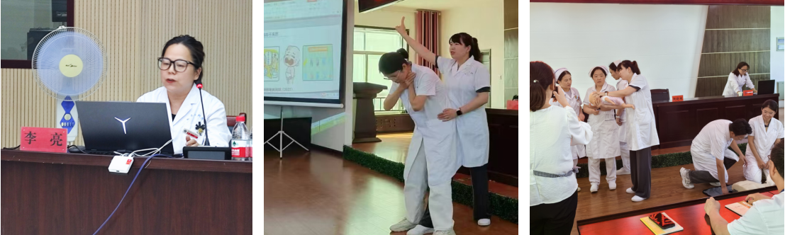 急诊外科高年资主治医师李亮作为本次讲座专家,她采取课件联合模拟人分步解析授课模式,细致讲授了心肺复苏、海姆立克急救法的施救原理、操作要点、大众误区。她向现场医护强调:现场急救要迅速、果断、精准,这是从死神手里“抢回”生命的三大法宝,其实施过程应要以“科学”的方法作为前提。随后,朱丹和靳晓艳护士担任实践指导老师,她们在向大家普及了AED的使用方法,然后对现场人员进行“手把手、逐一过”的技术指导,大家学习热情高涨,现场气氛热烈。