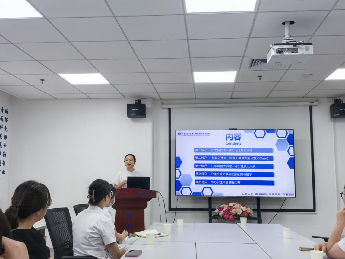 本次会议由护理科普小组核心成员、万秋园副护士长主持。护理部姚聪副主任出席会议并发表讲话,姚聪副主任强调了科普工作的重要性,同时对护理科普小组的工作给予了充分肯定,指出科普工作是提升公众健康意识和科学素养的重要途径,并鼓励护理科普小组充分发挥专业优势,利用好科普平台,用自己的专业知识为大众提供高质量的科普宣讲。